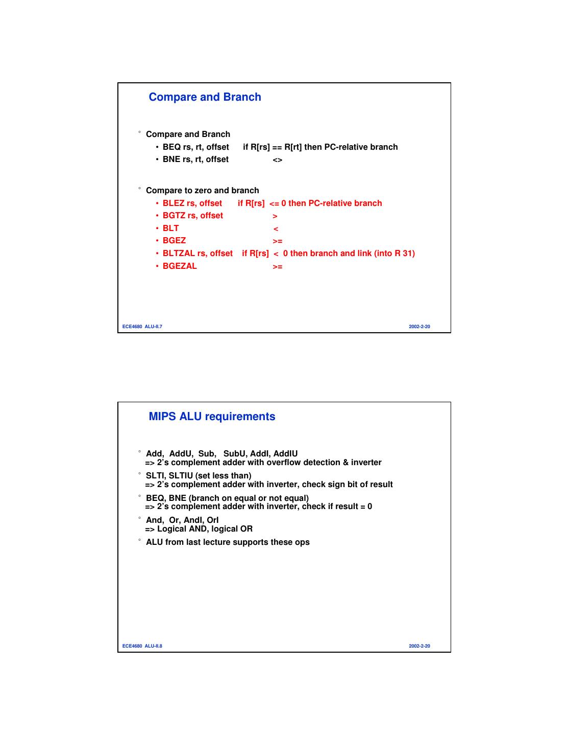 4 . Compare and Branch °Compare and Branch • BEQ rs, rt, offset if R[rs] == R[rt] then PC-relative branch • BNE rs, rt, offset <> °Compare to zero and branch • BLEZ rs, offset if R[rs] <= 0 then PC-relative branch • BGTZ rs, offset > • BLT < • BGEZ >= • BLTZAL rs, offset if R[rs] < 0 then branch and link (into R 31) • BGEZAL >= ECE4680 ALU-II.7 2002-2-20 MIPS ALU requirements °Add, AddU, Sub, SubU, AddI, AddIU => 2’s complement adder with overflow detection & inverter °SLTI, SLTIU (set less than) => 2’s complement adder with inverter, check sign bit of result °BEQ, BNE (branch on equal or not equal) => 2’s complement adder with inverter, check if result = 0 °And, Or, AndI, OrI => Logical AND, logical OR °ALU from last lecture supports these ops ECE4680 ALU-II.8 2002-2-20