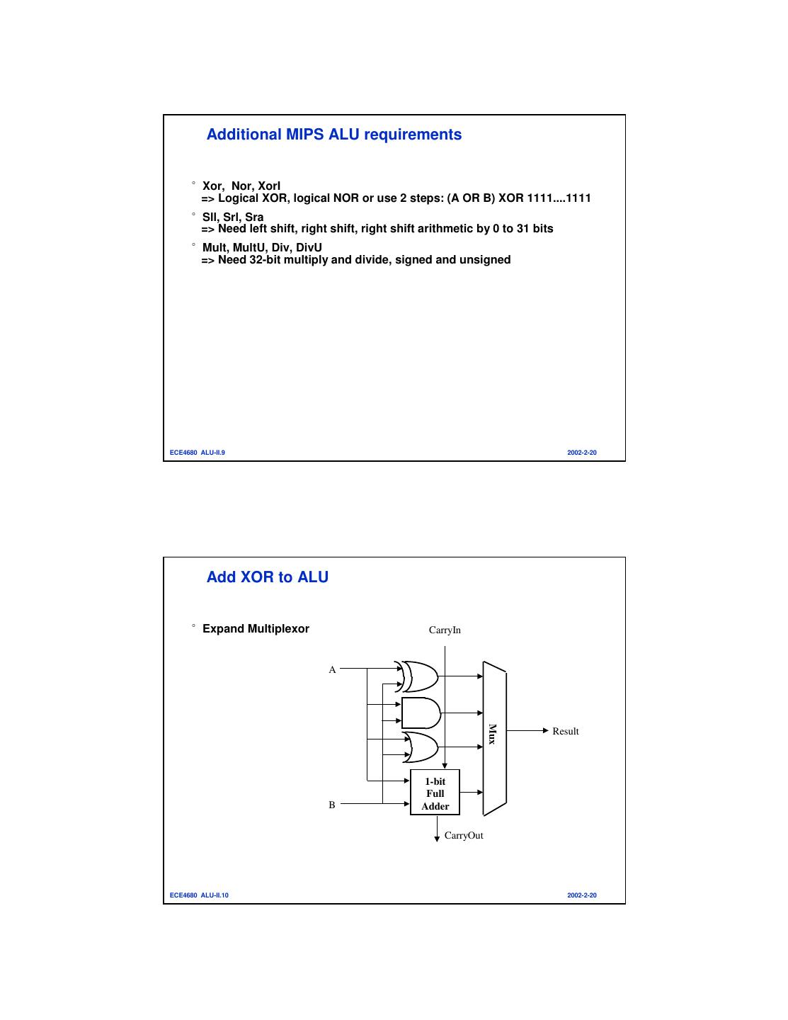 5 . Additional MIPS ALU requirements °Xor, Nor, XorI => Logical XOR, logical NOR or use 2 steps: (A OR B) XOR 1111....1111 °Sll, Srl, Sra => Need left shift, right shift, right shift arithmetic by 0 to 31 bits °Mult, MultU, Div, DivU => Need 32-bit multiply and divide, signed and unsigned ECE4680 ALU-II.9 2002-2-20 Add XOR to ALU °Expand Multiplexor CarryIn A Mux Result 1-bit Full B Adder CarryOut ECE4680 ALU-II.10 2002-2-20