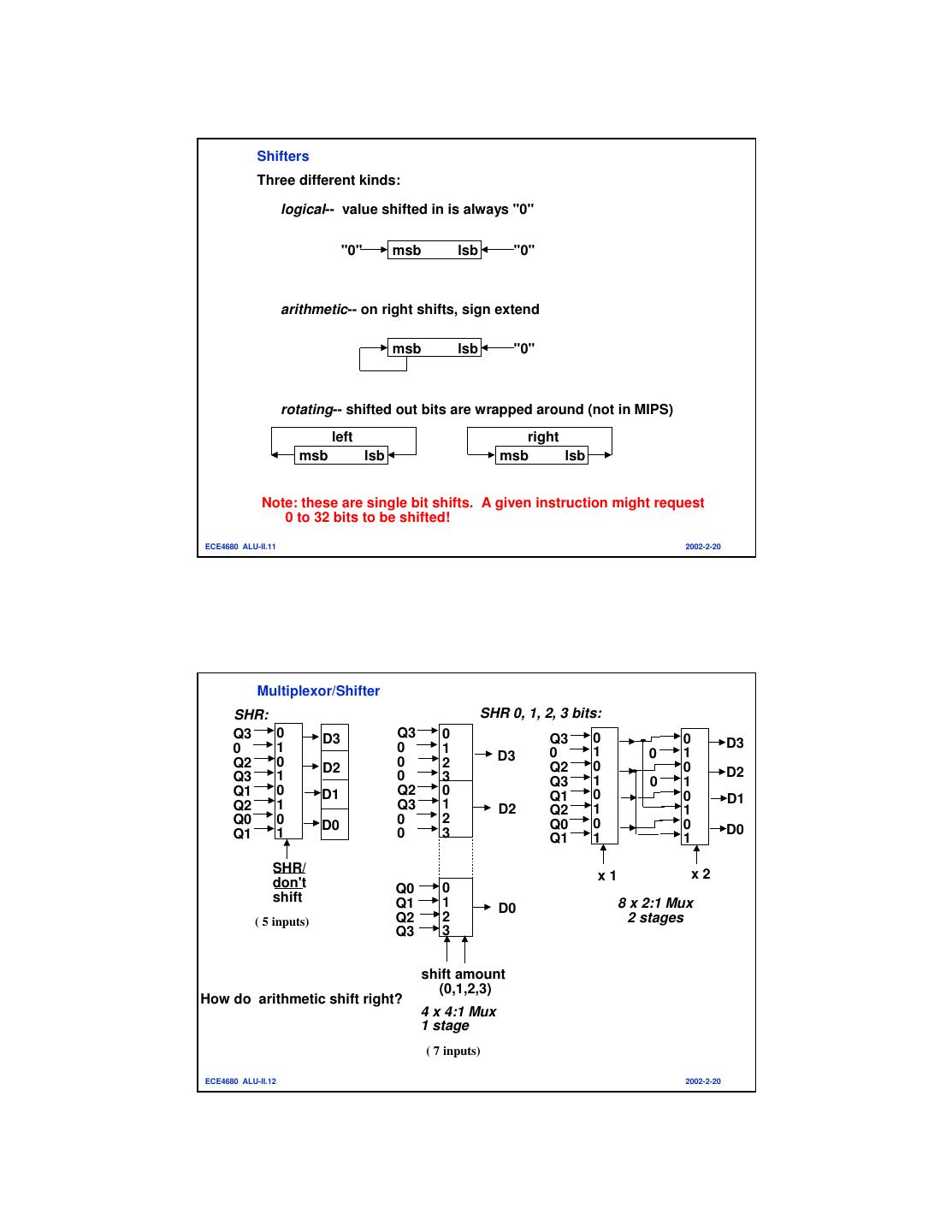 6 . Shifters Three different kinds: logical-- value shifted in is always "0" "0" msb lsb "0" arithmetic-- on right shifts, sign extend msb lsb "0" rotating-- shifted out bits are wrapped around (not in MIPS) left right msb lsb msb lsb Note: these are single bit shifts. A given instruction might request 0 to 32 bits to be shifted! ECE4680 ALU-II.11 2002-2-20 Multiplexor/Shifter SHR: SHR 0, 1, 2, 3 bits: Q3 0 D3 Q3 0 Q3 0 0 0 1 0 1 D3 D3 0 1 0 1 Q2 0 D2 0 2 Q2 0 0 Q3 1 0 3 D2 Q3 1 0 1 Q1 0 D1 Q2 0 Q1 0 0 Q2 1 Q3 1 D1 D2 Q2 1 1 Q0 0 0 2 Q0 0 0 D0 D0 Q1 1 0 3 Q1 1 1 SHR/ x2 x1 don't Q0 0 shift Q1 1 8 x 2:1 Mux D0 ( 5 inputs) Q2 2 2 stages Q3 3 shift amount (0,1,2,3) How do arithmetic shift right? 4 x 4:1 Mux 1 stage ( 7 inputs) ECE4680 ALU-II.12 2002-2-20