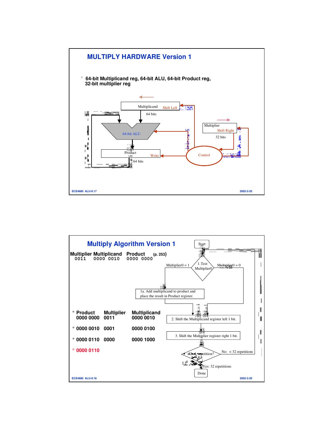 9 . MULTIPLY HARDWARE Version 1 °64-bit Multiplicand reg, 64-bit ALU, 64-bit Product reg, 32-bit multiplier reg Multiplicand Shift Left 64 bits Multiplier Shift Right 64-bit ALU 32 bits Product Write Control 64 bits ECE4680 ALU-II.17 2002-2-20 Multiply Algorithm Version 1 Start Multiplier Multiplicand Product (p. 253) 0011 0000 0010 0000 0000 Multiplier0 = 1 1.Test Multiplier0 = 0 Multiplier0 1a. Add multiplicand to product and place the result in Product register. ° Product Multiplier Multiplicand 0000 0000 0011 0000 0010 2. Shift the Multiplicand register left 1 bit. ° 0000 0010 0001 0000 0100 3. Shift the Multiplier register right 1 bit. ° 0000 0110 0000 0000 1000 ° 0000 0110 No: < 32 repetitions 32nd repetition? Yes: 32 repetitions Done ECE4680 ALU-II.18 2002-2-20