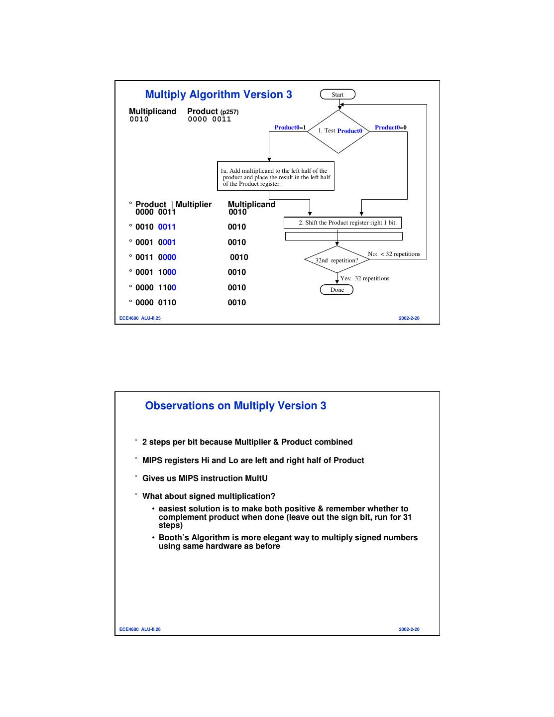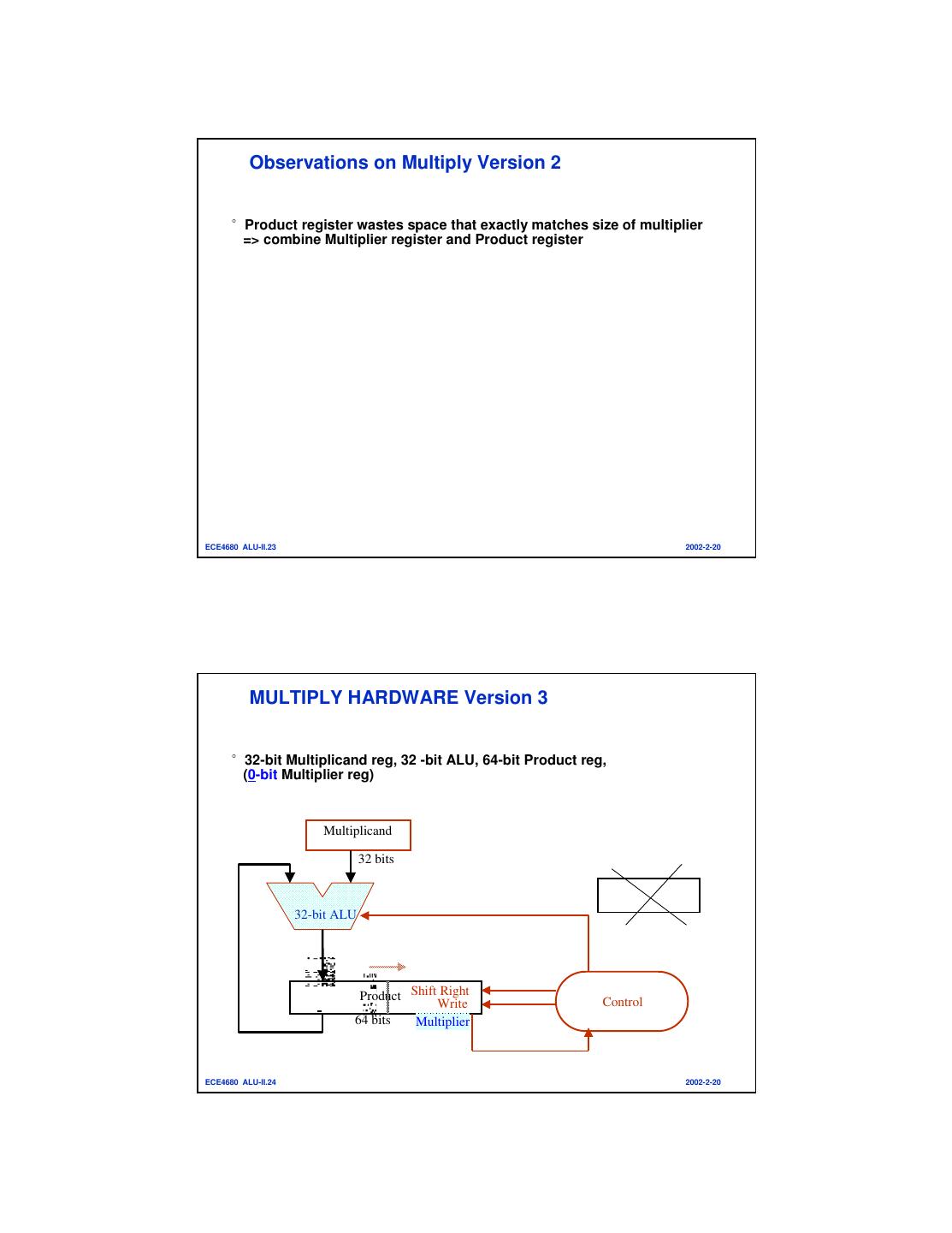 12 . Observations on Multiply Version 2 °Product register wastes space that exactly matches size of multiplier => combine Multiplier register and Product register ECE4680 ALU-II.23 2002-2-20 MULTIPLY HARDWARE Version 3 °32-bit Multiplicand reg, 32 -bit ALU, 64-bit Product reg, (0-bit Multiplier reg) Multiplicand 32 bits 32-bit ALU Product Shift Right Control Write 64 bits Multiplier ECE4680 ALU-II.24 2002-2-20