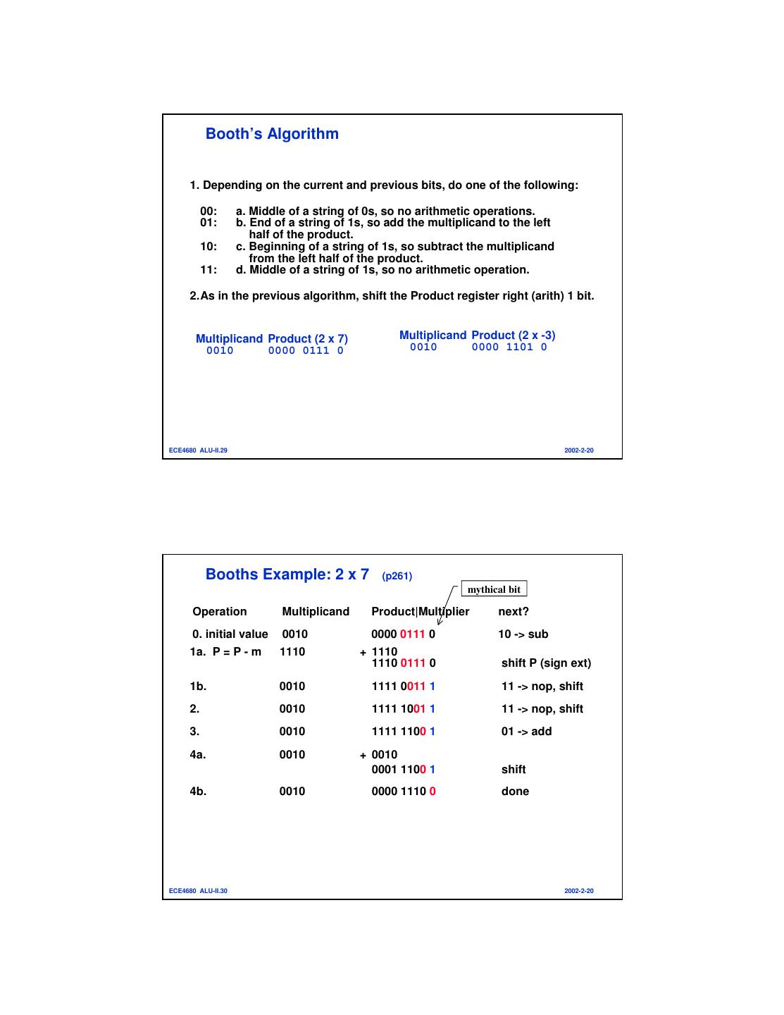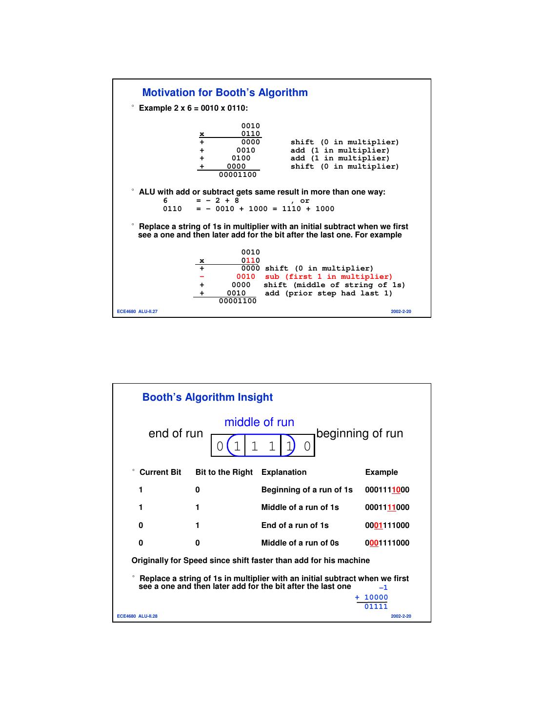 14 . Motivation for Booth’s Algorithm °Example 2 x 6 = 0010 x 0110: 0010 x 0110 + 0000 shift (0 in multiplier) + 0010 add (1 in multiplier) + 0100 add (1 in multiplier) + 0000 shift (0 in multiplier) 00001100 °ALU with add or subtract gets same result in more than one way: 6 = – 2 + 8 , or 0110 = – 0010 + 1000 = 1110 + 1000 °Replace a string of 1s in multiplier with an initial subtract when we first see a one and then later add for the bit after the last one. For example 0010 x 0110 + 0000 shift (0 in multiplier) – 0010 sub (first 1 in multiplier) + 0000 shift (middle of string of 1s) + 0010 add (prior step had last 1) 00001100 ECE4680 ALU-II.27 2002-2-20 Booth’s Algorithm Insight middle of run end of run beginning of run 0 1 1 1 1 0 °Current Bit Bit to the Right Explanation Example 1 0 Beginning of a run of 1s 0001111000 1 1 Middle of a run of 1s 0001111000 0 1 End of a run of 1s 0001111000 0 0 Middle of a run of 0s 0001111000 Originally for Speed since shift faster than add for his machine °Replace a string of 1s in multiplier with an initial subtract when we first see a one and then later add for the bit after the last one –1 + 10000 01111 ECE4680 ALU-II.28 2002-2-20