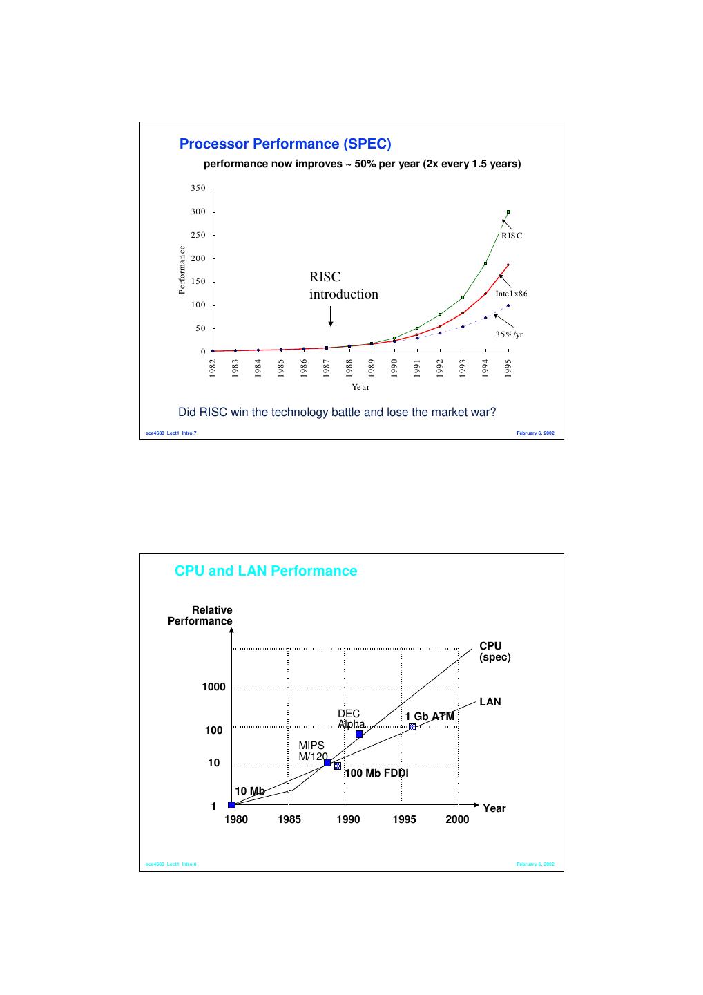 4 . Processor Performance (SPEC) performance now improves ~ 50% per year (2x every 1.5 years) 350 300 250 RIS C P e rforma nce 200 150 RISC introduction Inte l x86 100 50 35%/yr 0 1982 1983 1984 1985 1986 1987 1988 1989 1990 1991 1992 1993 1994 1995 Ye ar Did RISC win the technology battle and lose the market war? ece4680 Lect1 Intro.7 February 6, 2002 CPU and LAN Performance Relative Performance CPU (spec) 1000 LAN DEC 1 Gb ATM Alpha 100 MIPS M/120 10 100 Mb FDDI 10 Mb 1 Year 1980 1985 1990 1995 2000 ece4680 Lect1 Intro.8 February 6, 2002