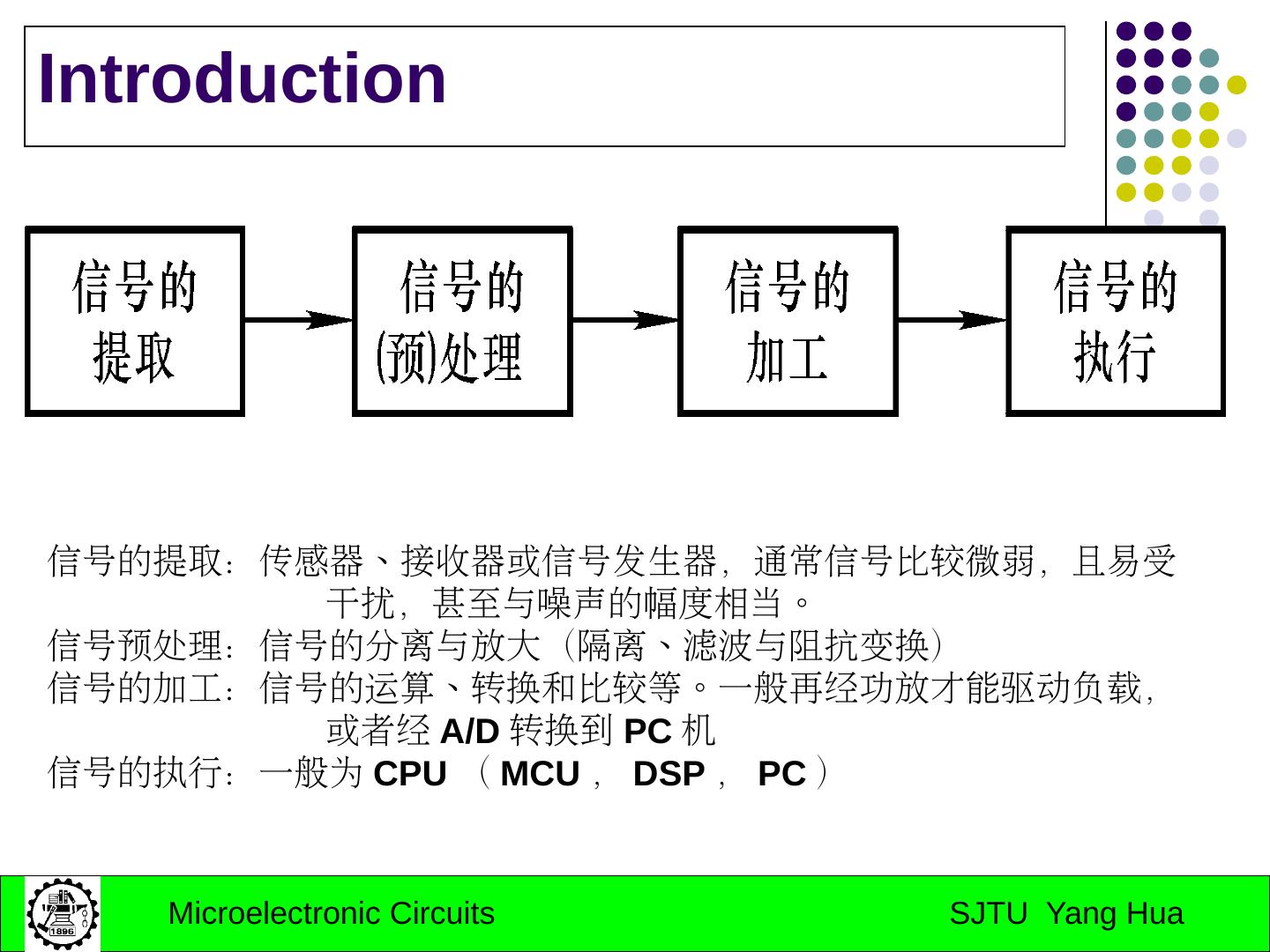 2 .Introduction 信号的提取:传感器、接收器或信号发生器,通常信号比较微弱,且易受 干扰,甚至与噪声的幅度相当。 信号预处理:信号的分离与放大(隔离、滤波与阻抗变换) 信号的加工:信号的运算、转换和比较等。一般再经功放才能驱动负载, 或者经 A/D 转换到 PC 机 信号的执行:一般为 CPU ( MCU , DSP , PC )
