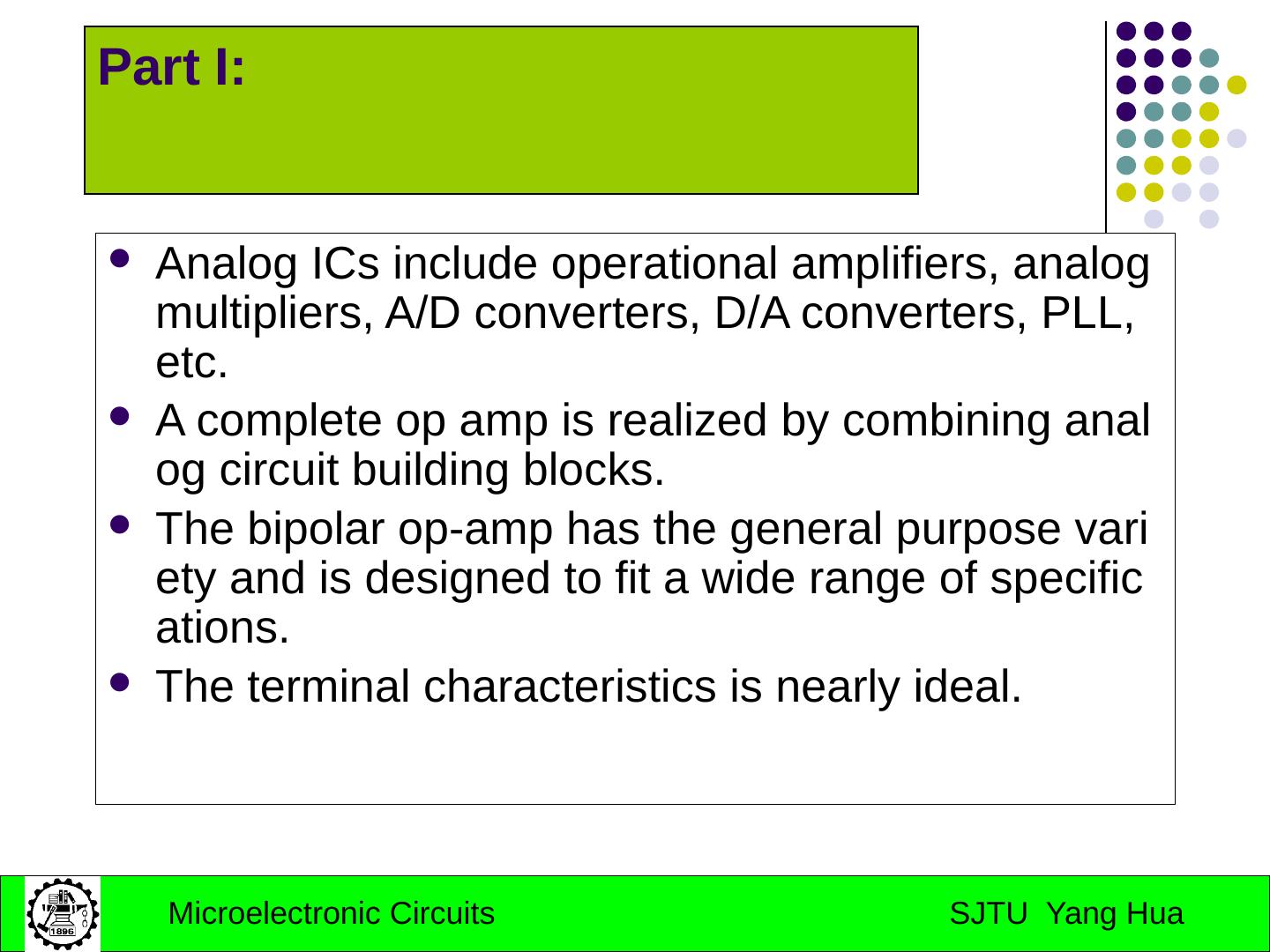 4 .Part I: Analog ICs include operational amplifiers, analog multipliers, A/D converters, D/A converters, PLL, etc. A complete op amp is realized by combining analog circuit building blocks. The bipolar op-amp has the general purpose variety and is designed to fit a wide range of specifications. The terminal characteristics is nearly ideal.