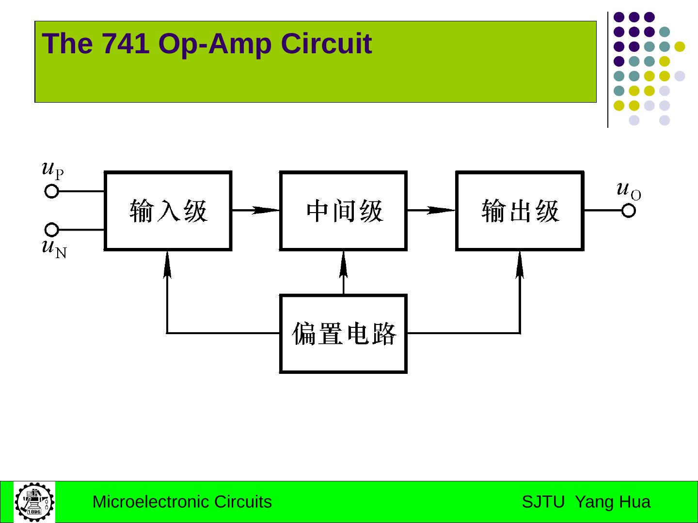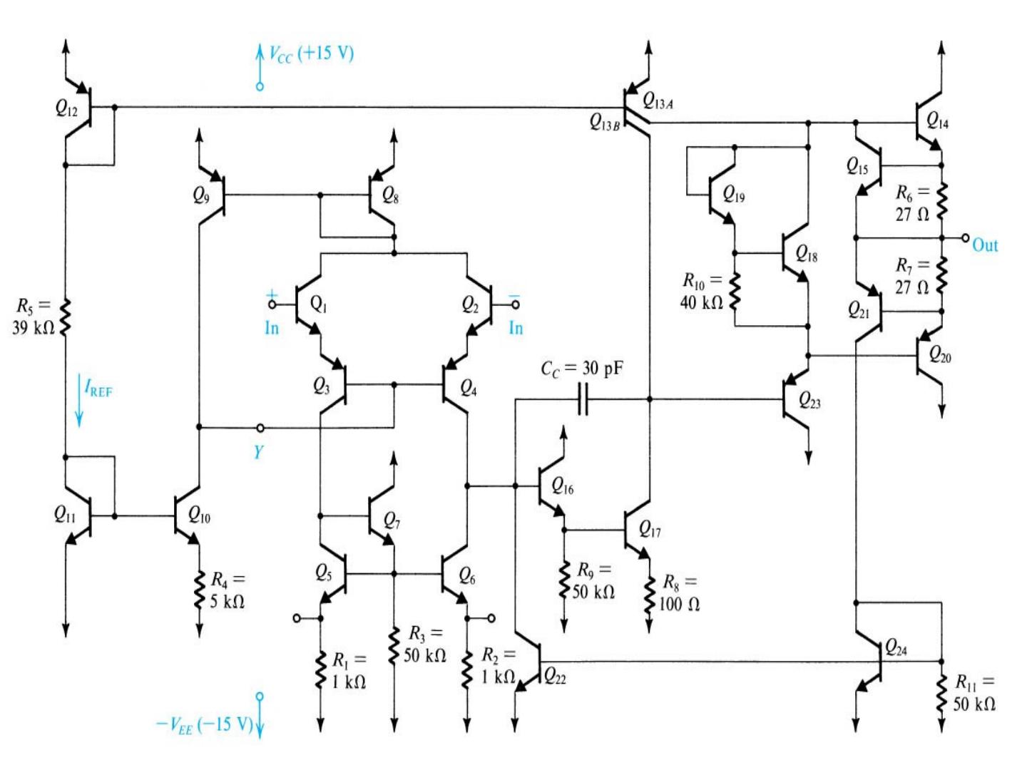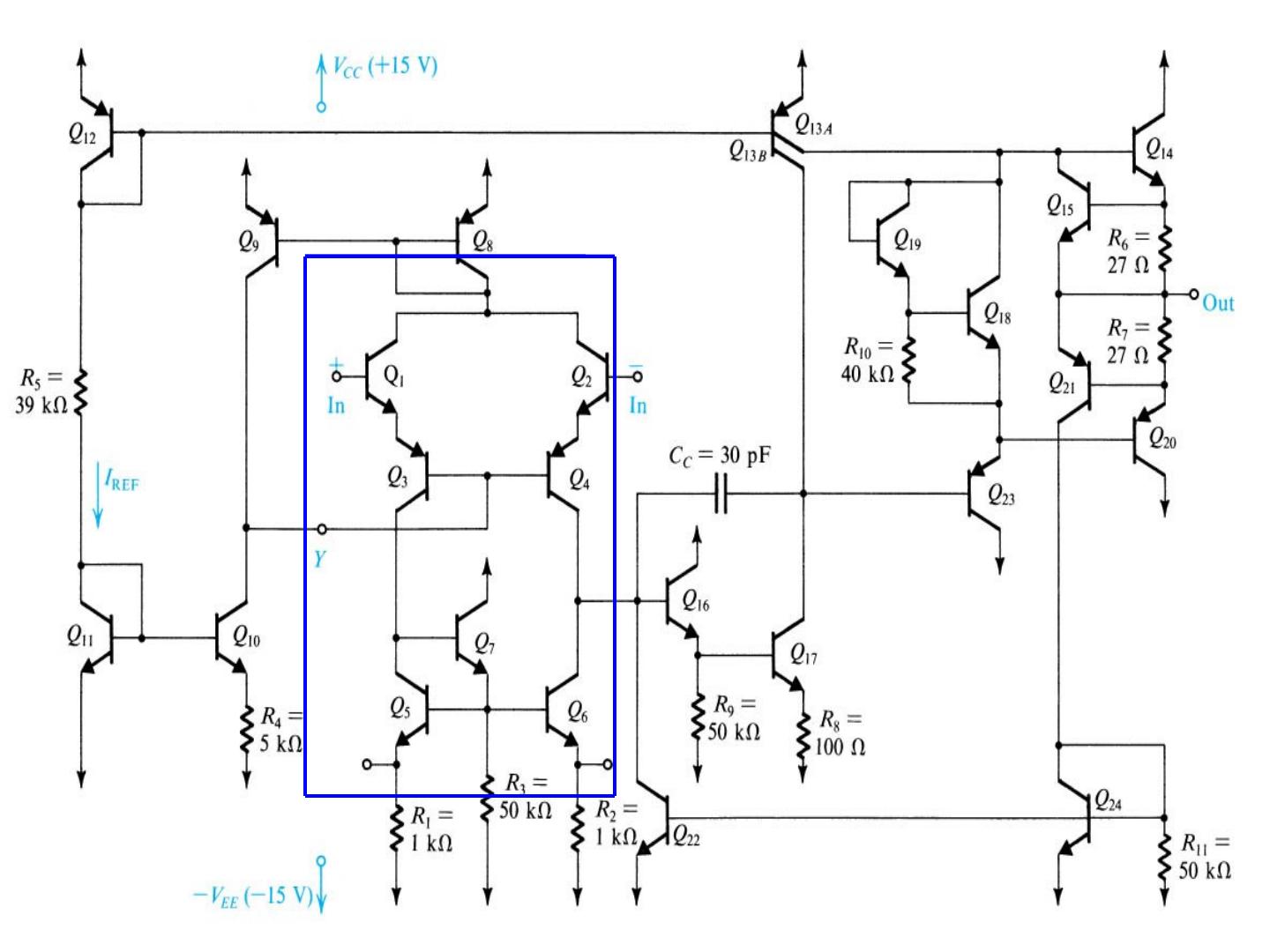 10 .The Input Stage The input stage consists of transistors Q1 through Q7. Q1-Q4 is the differential version of CC and CB configuration. High input resistance. Current source ( Q5-Q7 ) is the active load of input stage. It not only provides a high-resistance load but also converts the signal from differential to single-ended form with no loss in gain or common-mode rejection.