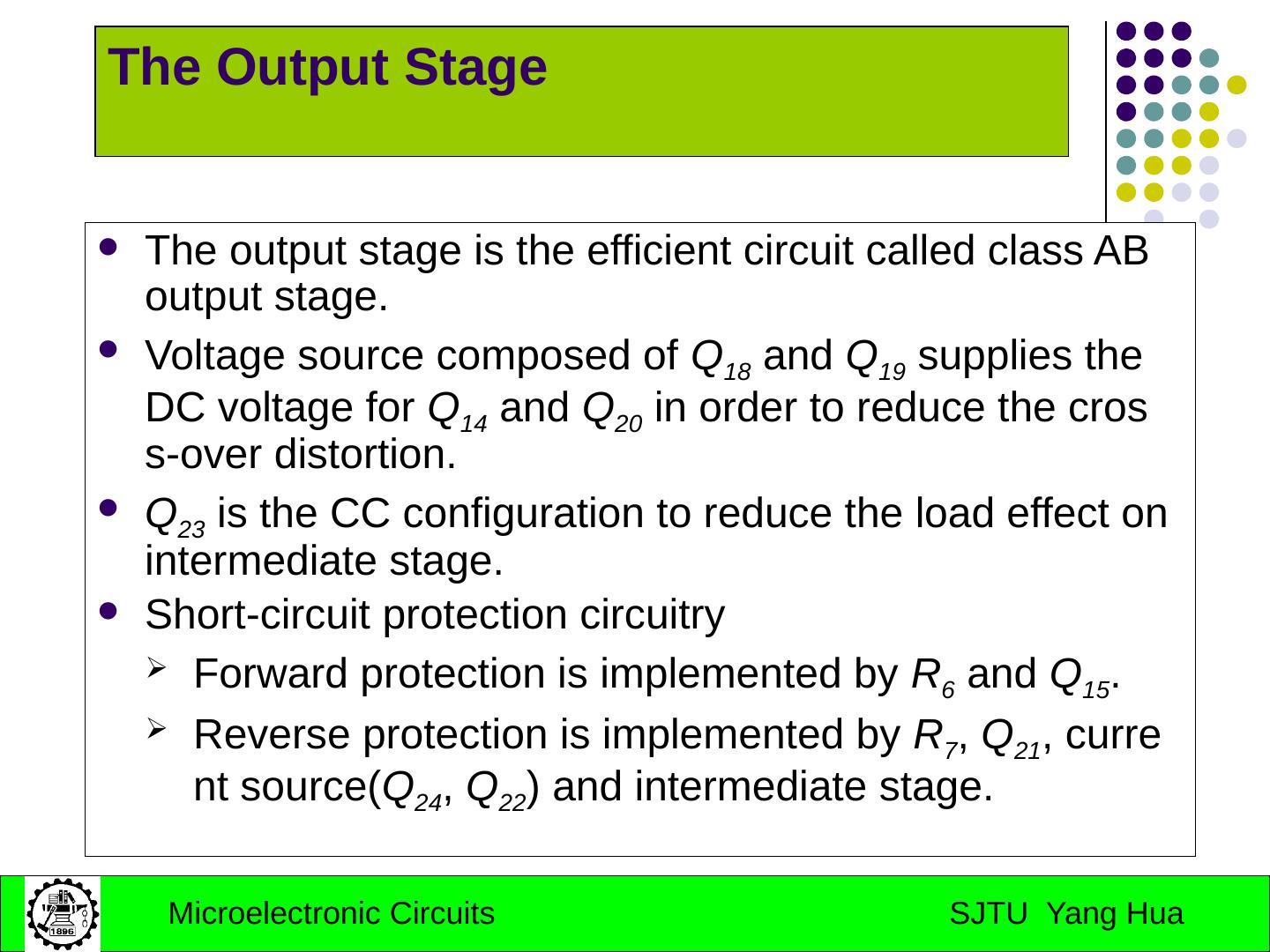 13 .The Output Stage The output stage is the efficient circuit called class AB output stage. Voltage source composed of Q 18 and Q 19 supplies the DC voltage for Q 14 and Q 20 in order to reduce the cross-over distortion. Q 23 is the CC configuration to reduce the load effect on intermediate stage. Short-circuit protection circuitry Forward protection is implemented by R 6 and Q 15 . Reverse protection is implemented by R 7 , Q 21 , current source( Q 24 , Q 22 ) and intermediate stage.