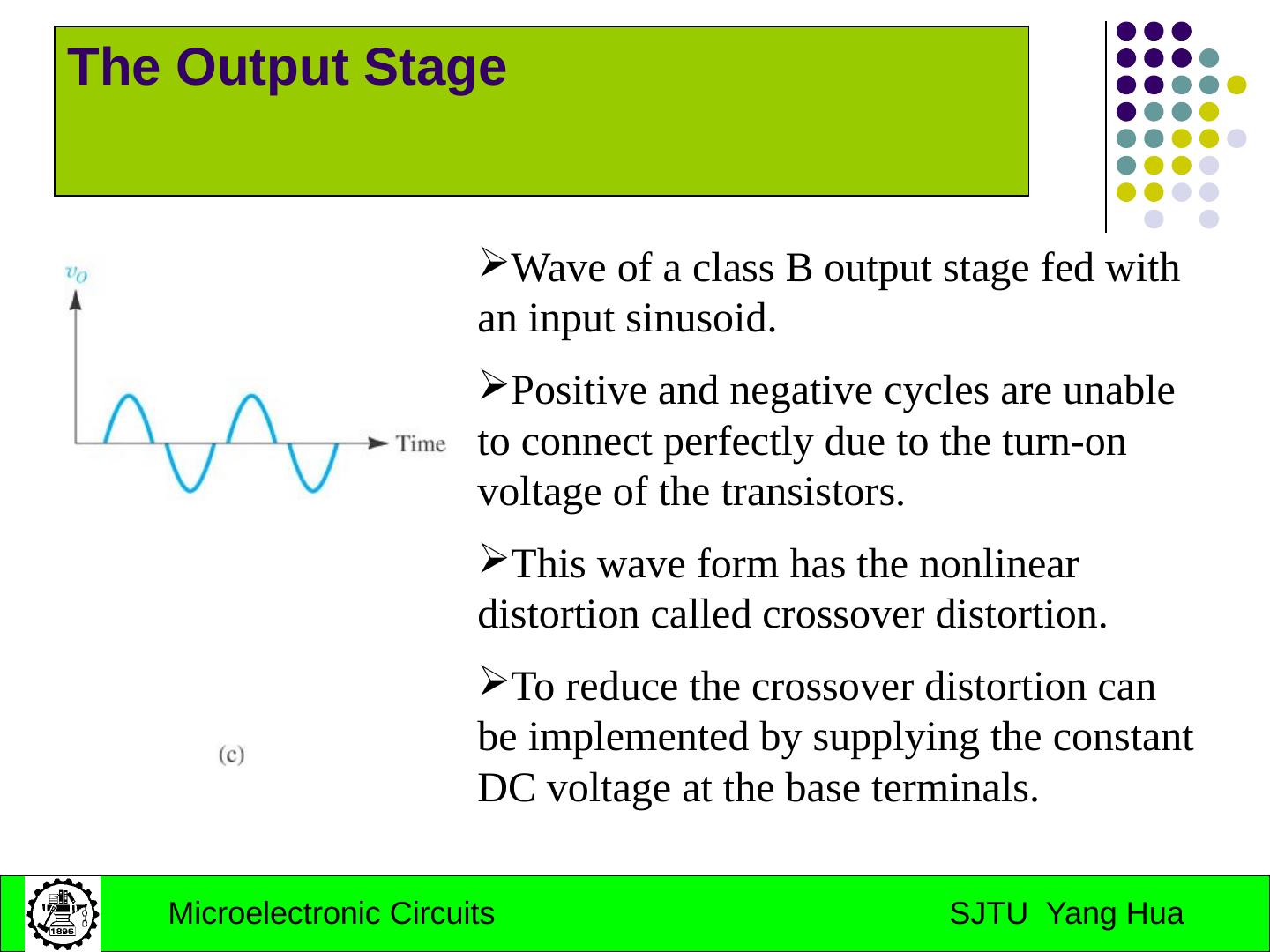 15 .The Output Stage Wave of a class B output stage fed with an input sinusoid. Positive and negative cycles are unable to connect perfectly due to the turn-on voltage of the transistors. This wave form has the nonlinear distortion called crossover distortion. To reduce the crossover distortion can be implemented by supplying the constant DC voltage at the base terminals.