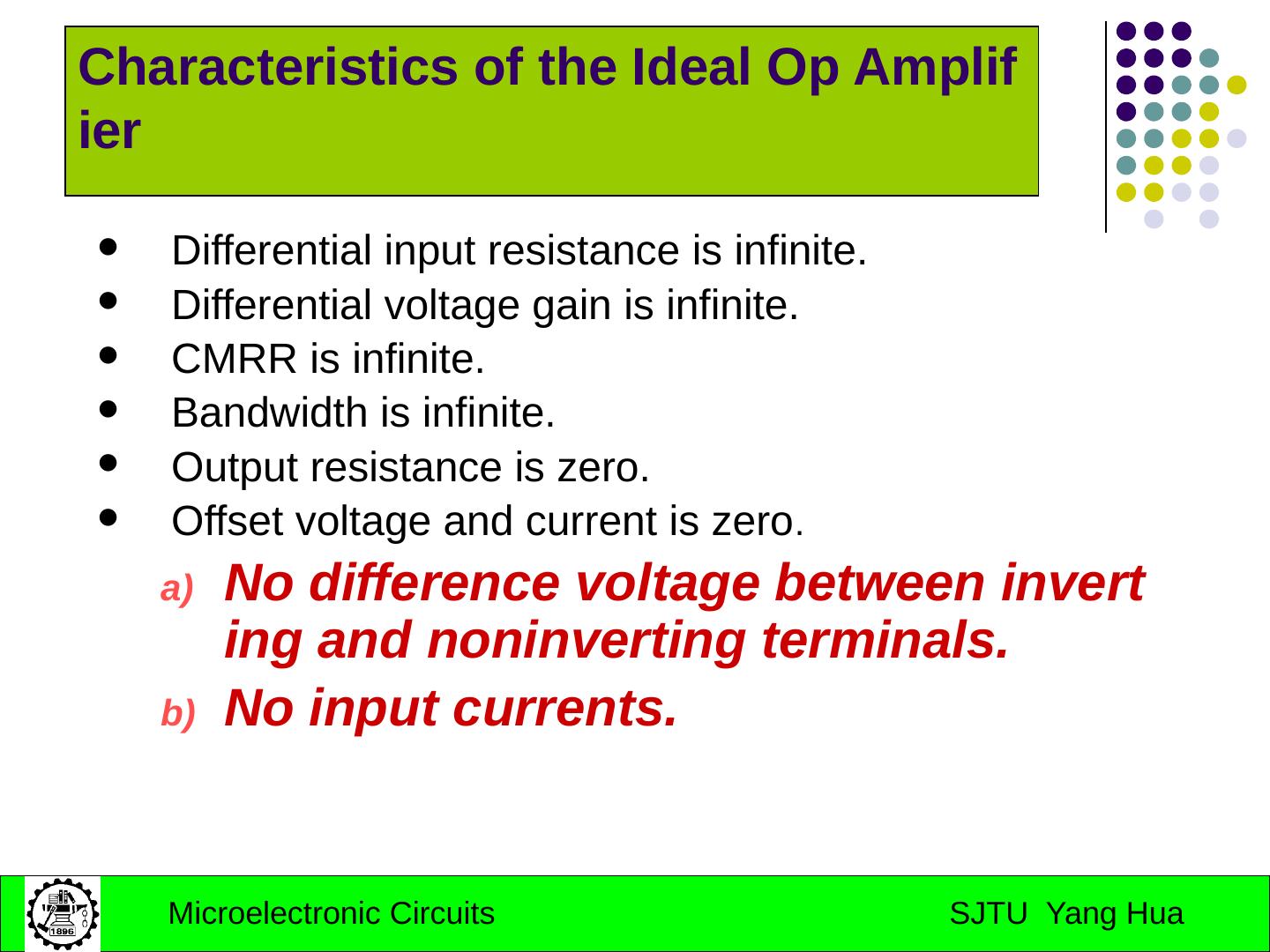 21 .Characteristics of the Ideal Op Amplifier Differential input resistance is infinite. Differential voltage gain is infinite. CMRR is infinite. Bandwidth is infinite. Output resistance is zero. Offset voltage and current is zero . No difference voltage between inverting and noninverting terminals. No input currents.