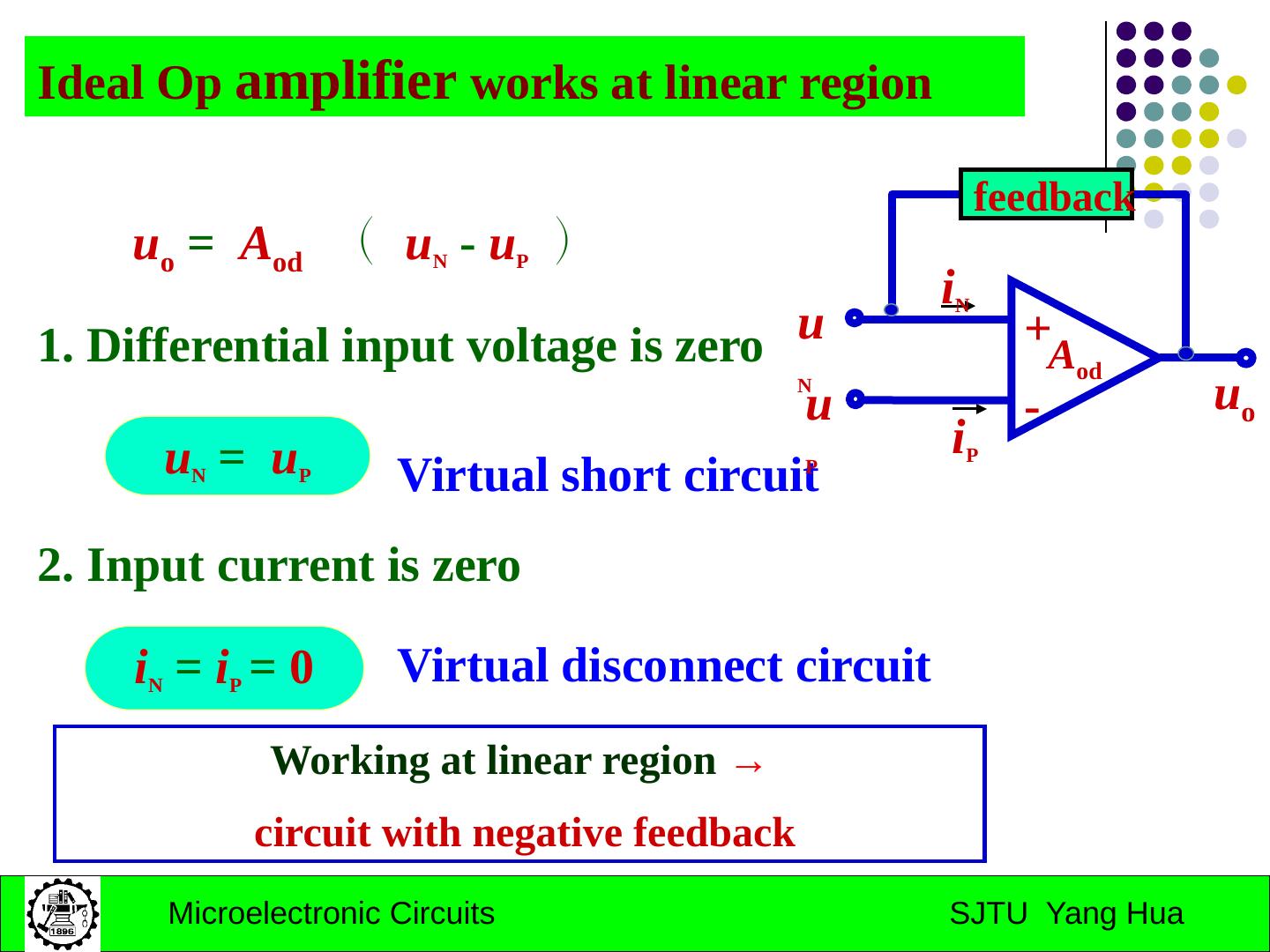 22 .i N = i P = 0 u N = u P 1. Differential input voltage is zero 2. Input current is zero u o = A od ( u N - u P ) Virtual short circuit Virtual disconnect circuit A od + - u N u P u o i N i P feedback Working at linear region → circuit with negative feedback Ideal Op amplifier works at linear region