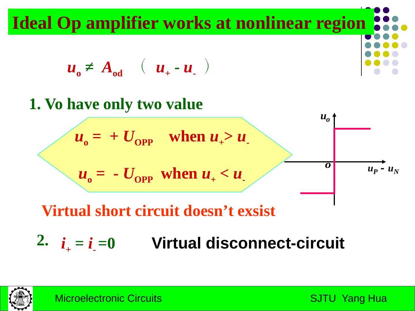 23 .Ideal Op amplifier works at nonlinear region u o ≠ A od ( u + - u - ) u o = + U OPP when u + > u - u o = - U OPP when u + < u - 1. Vo have only two value 2. i + = i - =0 Virtual disconnect-circuit Virtual short circuit doesn’t exsist