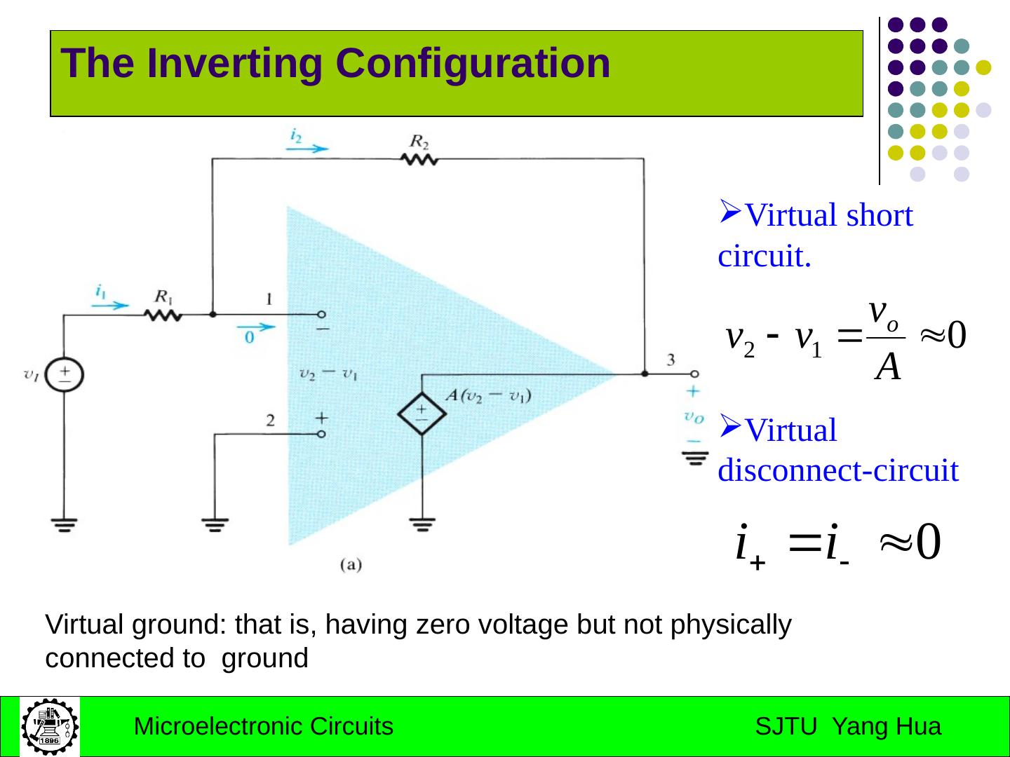 25 .The Inverting Configuration Virtual short circuit . Virtual ground: that is, having zero voltage but not physically connected to ground Virtual disconnect-circuit