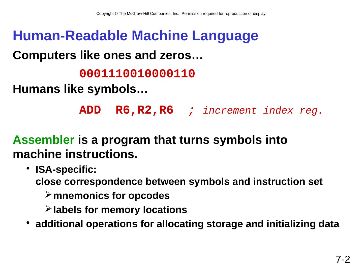 2 .7- 2 Human-Readable Machine Language Computers like ones and zeros… Humans like symbols… Assembler is a program that turns symbols into machine instructions. ISA-specific: close correspondence between symbols and instruction set mnemonics for opcodes labels for memory locations additional operations for allocating storage and initializing data ADD R6,R2,R6 ; increment index reg. 0001110010000110
