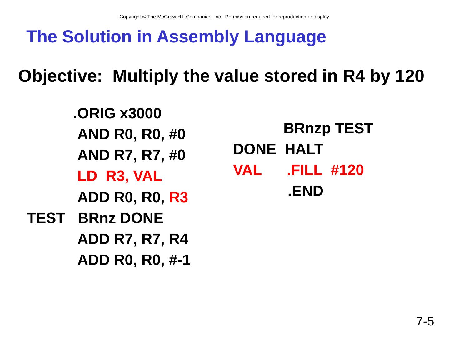 5 .The Solution in Assembly Language . ORIG x3000 AND R0, R0, #0 AND R7, R7, # 0 LD R3, VAL ADD R0, R0, R3 TEST BRnz DONE ADD R7, R7, R4 ADD R0, R0, #-1 BRnzp TEST DONE HALT VAL .FILL #120 .END 7- 5 Objective: Multiply the value stored in R4 by 120