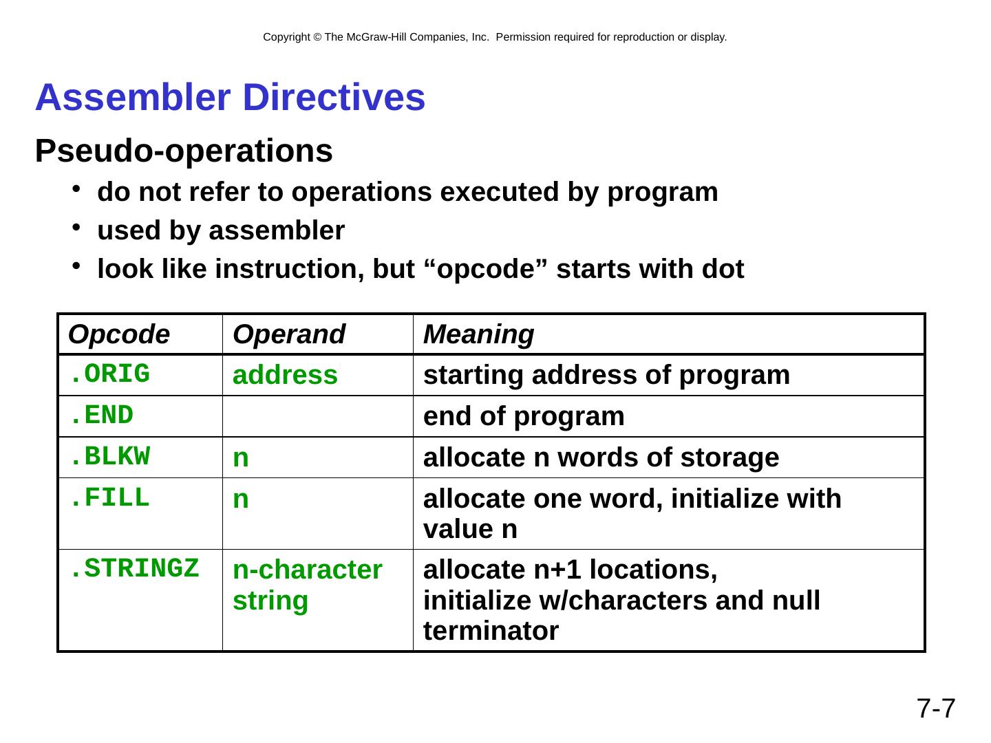 7 .7- 7 Assembler Directives Pseudo-operations do not refer to operations executed by program used by assembler look like instruction, but “opcode” starts with dot Opcode Operand Meaning .ORIG address starting address of program .END end of program .BLKW n allocate n words of storage .FILL n allocate one word, initialize with value n .STRINGZ n-character string allocate n+1 locations, initialize w/characters and null terminator