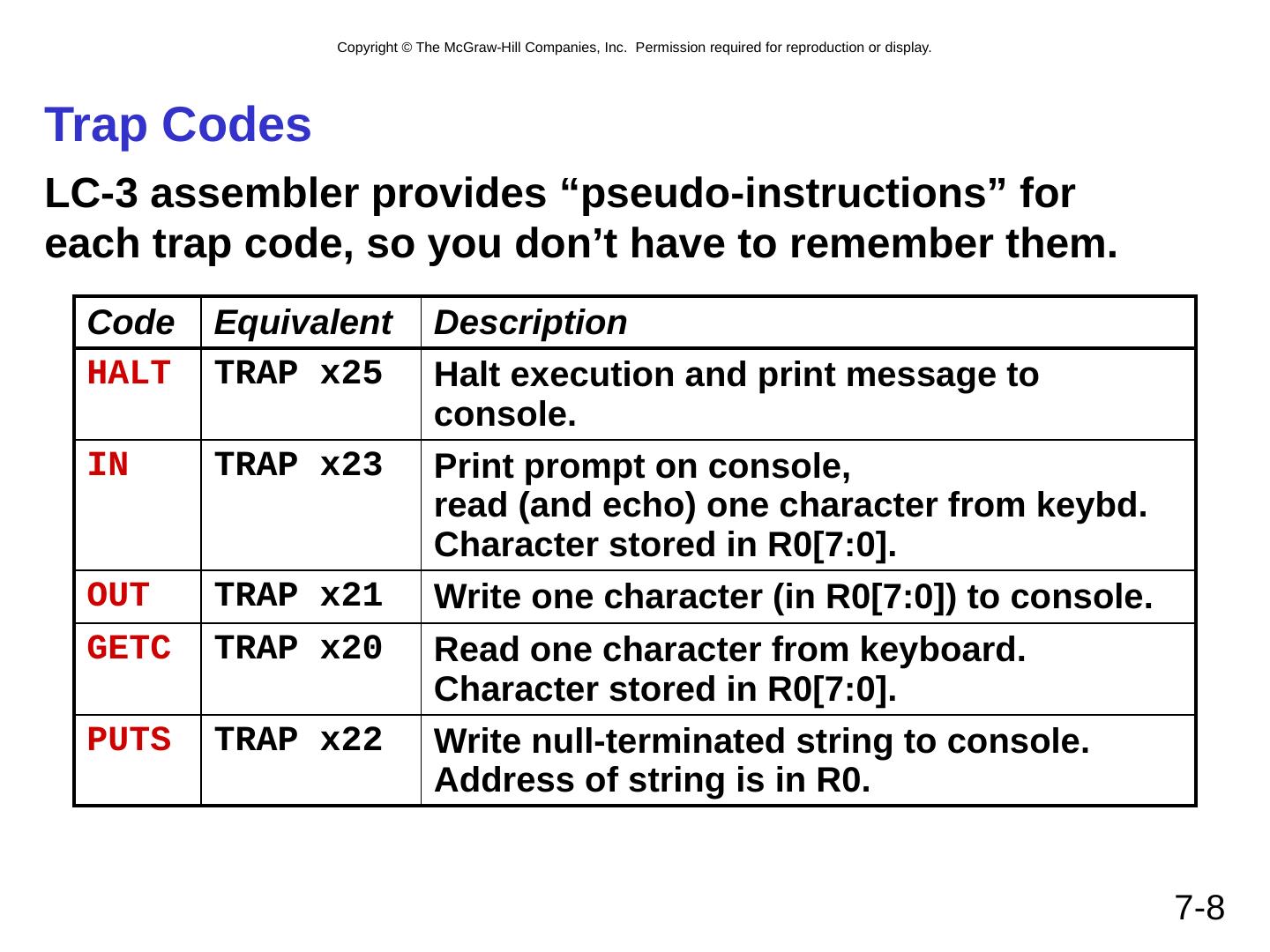 8 .7- 8 Trap Codes LC-3 assembler provides “pseudo-instructions” for each trap code, so you don’t have to remember them. Code Equivalent Description HALT TRAP x25 Halt execution and print message to console. IN TRAP x23 Print prompt on console, read (and echo) one character from keybd. Character stored in R0[7:0]. OUT TRAP x21 Write one character (in R0[7:0]) to console. GETC TRAP x20 Read one character from keyboard. Character stored in R0[7:0]. PUTS TRAP x22 Write null-terminated string to console. Address of string is in R0.