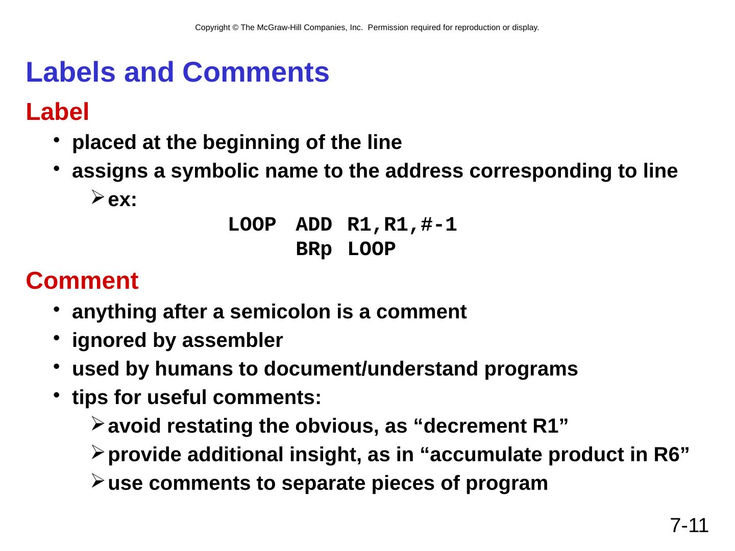 11 .7- 11 Labels and Comments Label placed at the beginning of the line assigns a symbolic name to the address corresponding to line ex: LOOP ADD R1,R1,#-1 BRp LOOP Comment anything after a semicolon is a comment ignored by assembler used by humans to document/understand programs tips for useful comments: avoid restating the obvious, as “decrement R1” provide additional insight, as in “accumulate product in R6” use comments to separate pieces of program