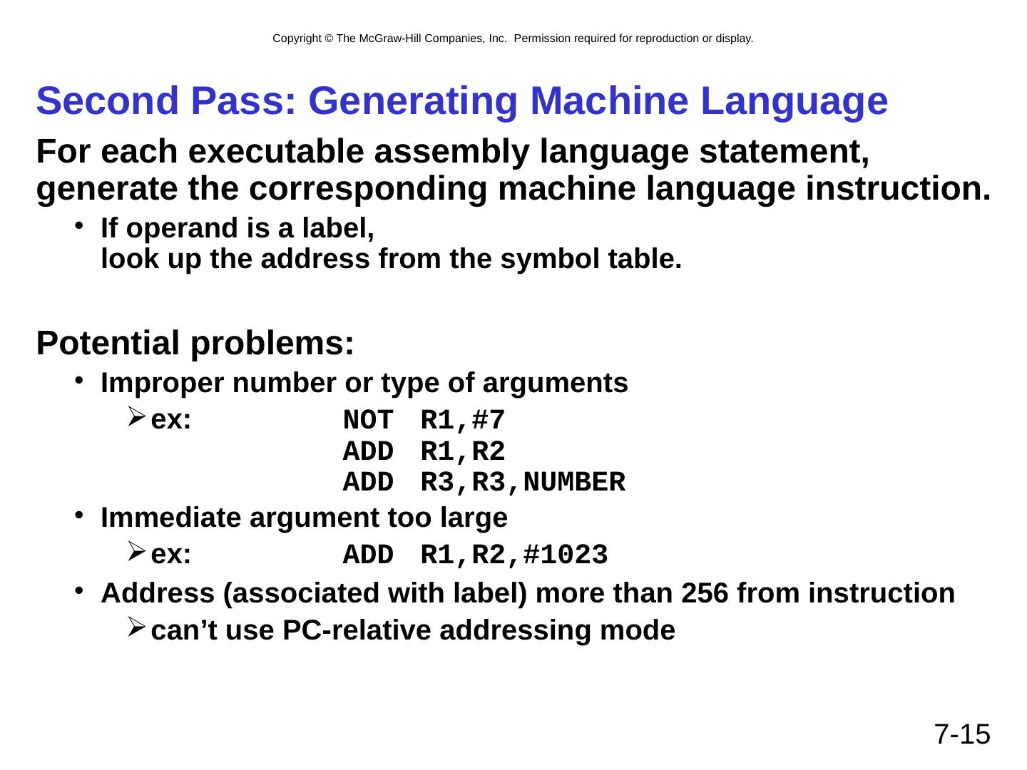 15 .7- 15 Second Pass: Generating Machine Language For each executable assembly language statement, generate the corresponding machine language instruction. If operand is a label, look up the address from the symbol table. Potential problems: Improper number or type of arguments ex: NOT R1,#7 ADD R1,R2 ADD R3,R3,NUMBER Immediate argument too large ex: ADD R1,R2,#1023 Address (associated with label) more than 256 from instruction can’t use PC-relative addressing mode