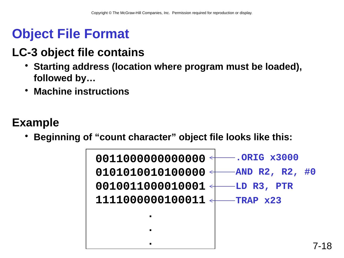 18 .7- 18 Object File Format LC-3 object file contains Starting address (location where program must be loaded), followed by… Machine instructions Example Beginning of “count character” object file looks like this: 0011000000000000 0101010010100000 0010011000010001 1111000000100011 . . . .ORIG x3000 AND R2, R2, #0 LD R3, PTR TRAP x23