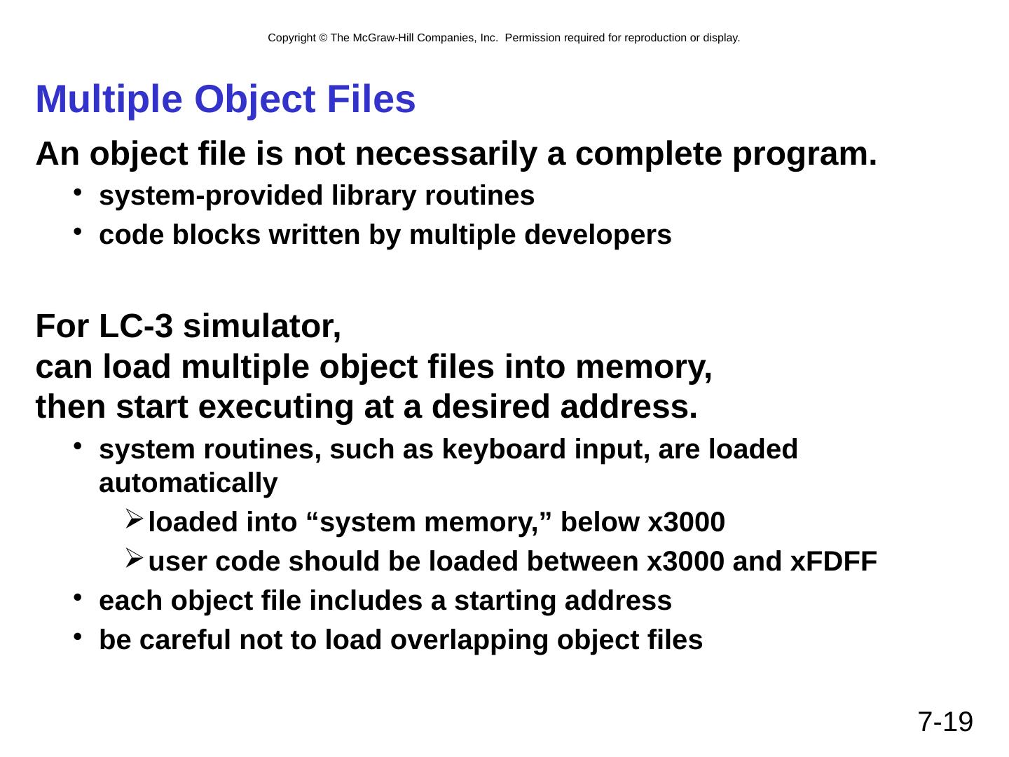 19 .7- 19 Multiple Object Files An object file is not necessarily a complete program. system-provided library routines code blocks written by multiple developers For LC-3 simulator, can load multiple object files into memory, then start executing at a desired address. system routines, such as keyboard input, are loaded automatically loaded into “system memory,” below x3000 user code should be loaded between x3000 and xFDFF each object file includes a starting address be careful not to load overlapping object files