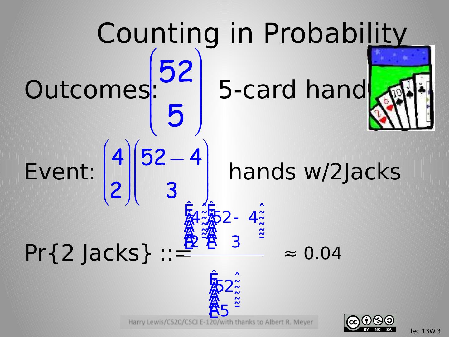 3 .Outcomes : 5-card hands Event : hands w/2Jacks Pr {2 Jacks} :: = ≈ 0.04 Counting in Probability lec 13W. 3