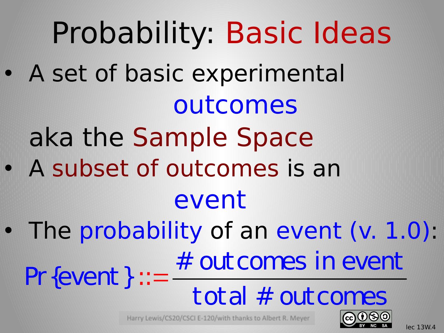 4 .A set of basic experimental outcomes aka the Sample Space A subset of outcomes is an event The probability of an event ( v . 1.0) : Probability: Basic Ideas lec 13W. 4