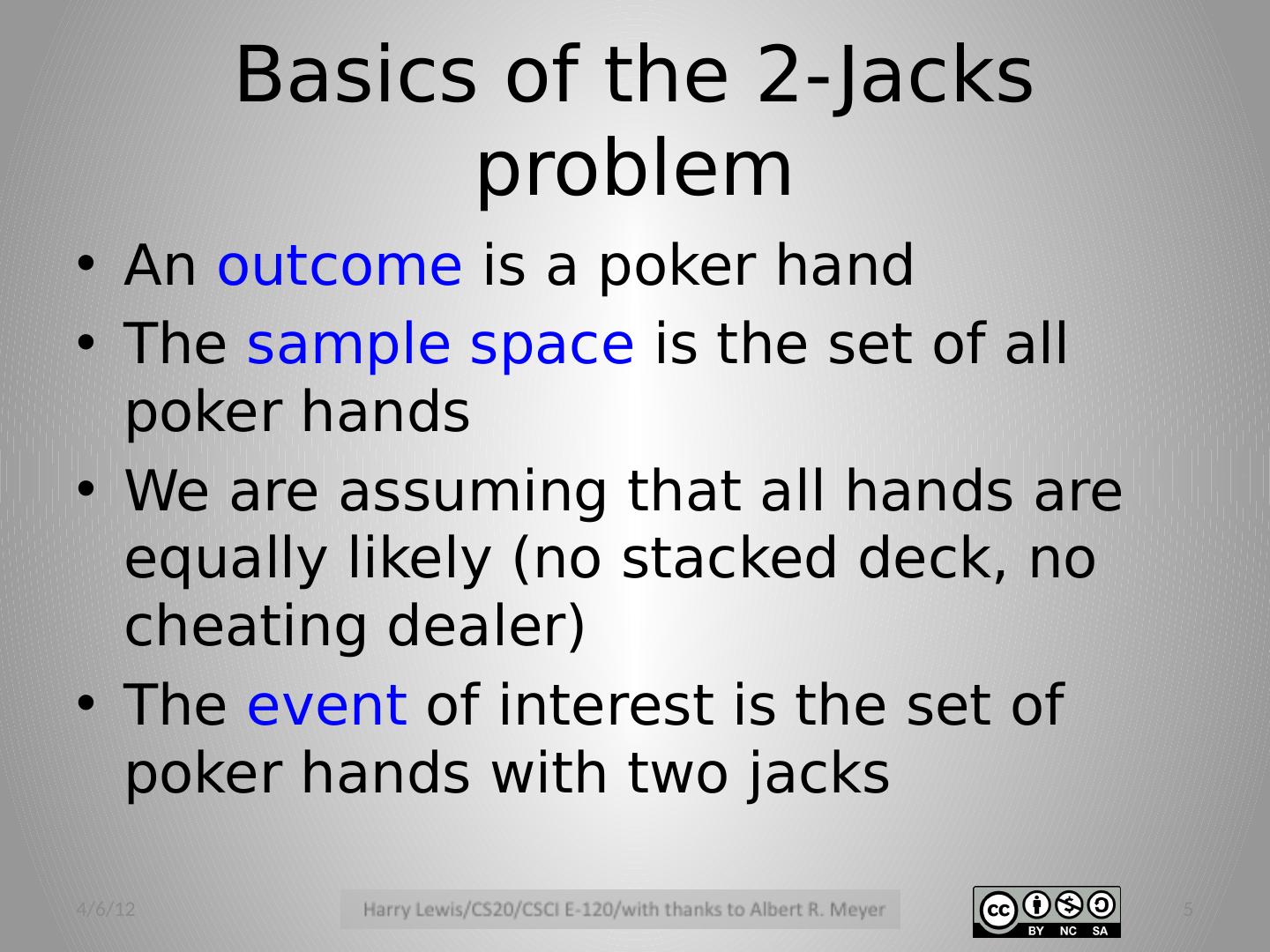 5 .Basics of the 2-Jacks problem An outcome is a poker hand The sample space is the set of all poker hands We are assuming that all hands are equally likely (no stacked deck, no cheating dealer) The event of interest is the set of poker hands with two jacks 4/6/12 5
