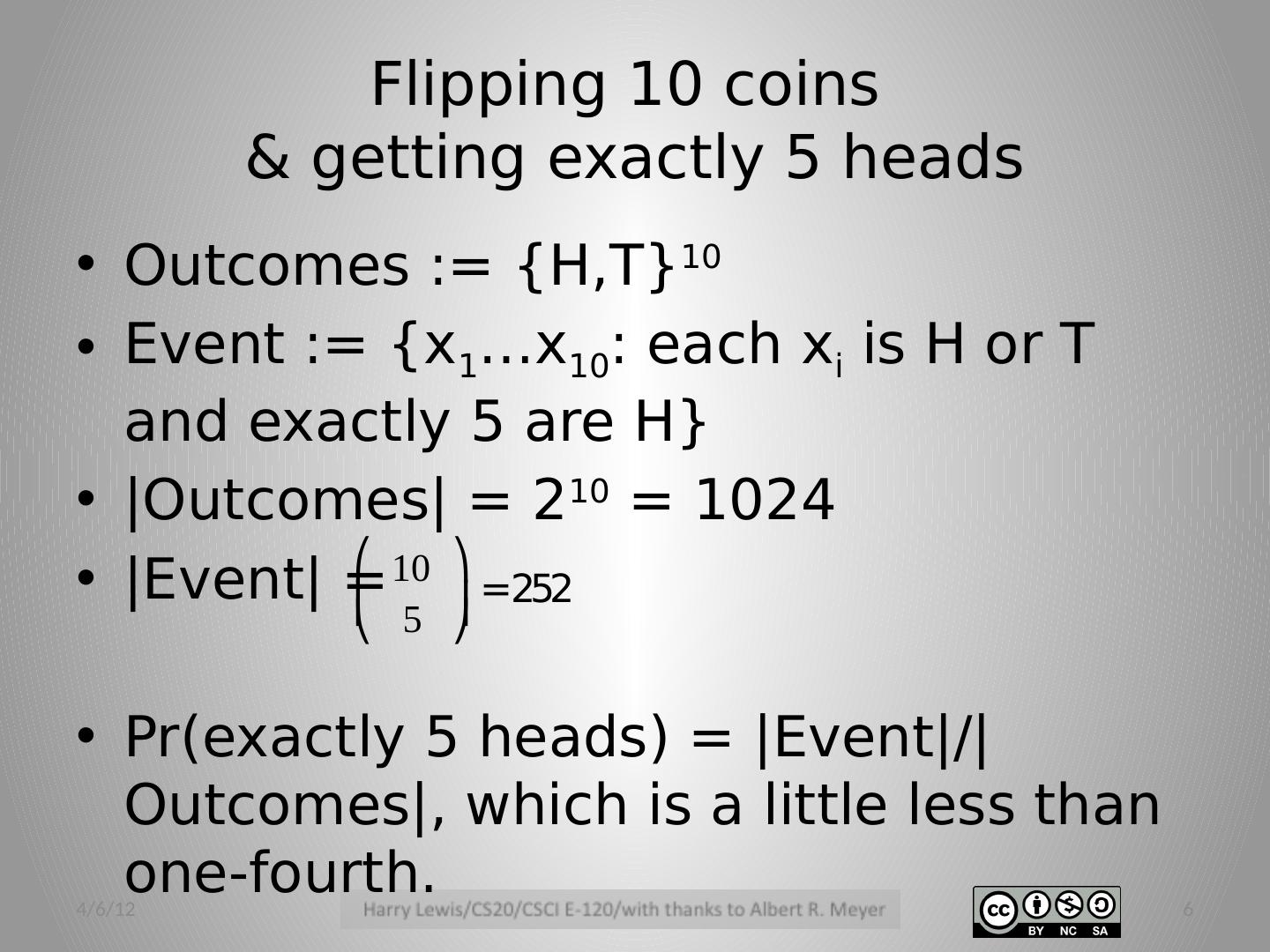 6 .Flipping 10 coins & getting exactly 5 heads Outcomes := {H,T} 10 Event := {x 1 …x 10 : each x i is H or T and exactly 5 are H} |Outcomes| = 2 10 = 1024 |Event| = Pr(exactly 5 heads) = |Event|/|Outcomes|, which is a little less than one-fourth. 4/6/12 6