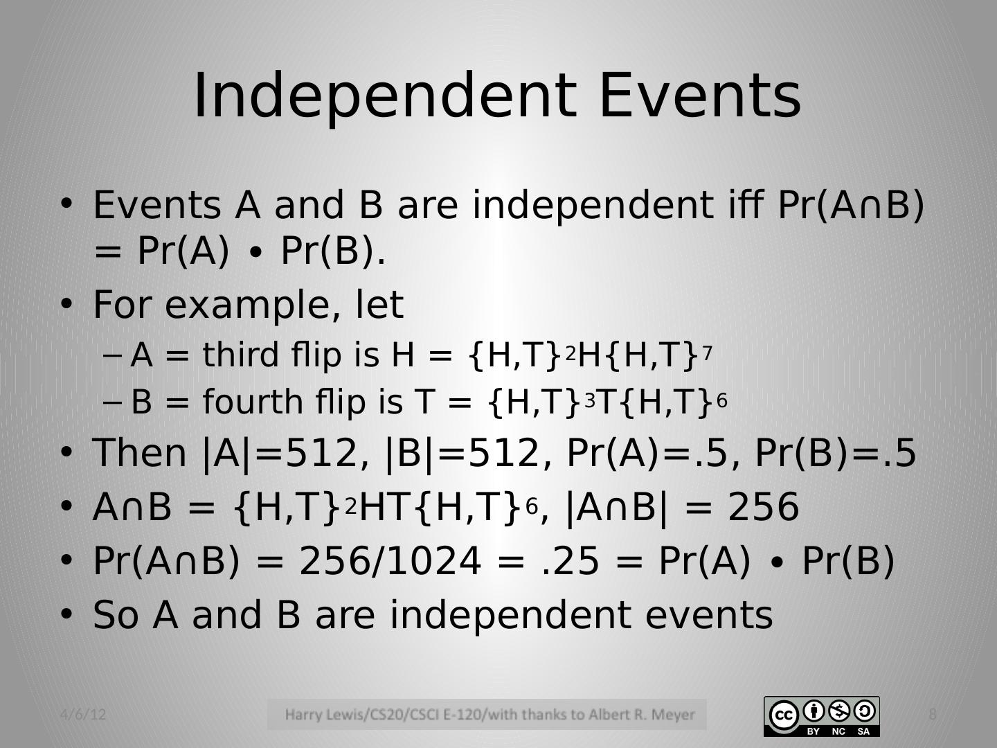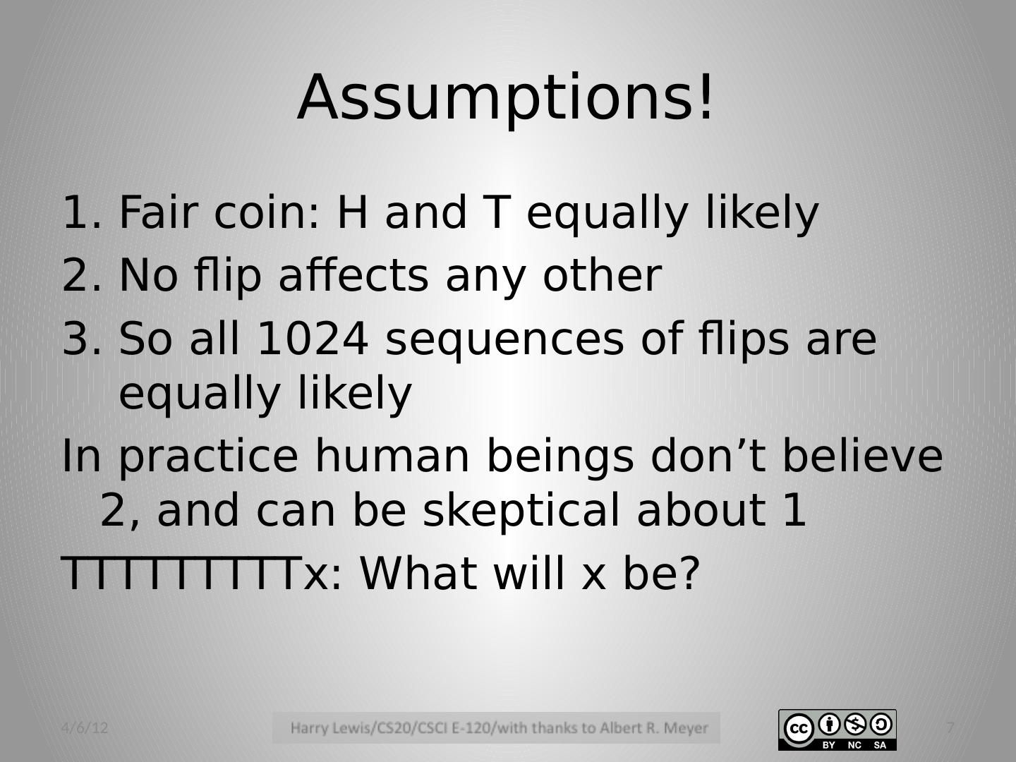 7 .Assumptions! Fair coin: H and T equally likely No flip affects any other So all 1024 sequences of flips are equally likely In practice human beings don’t believe 2, and can be skeptical about 1 TTTTTTTTTx : What will x be? 4/6/12 7