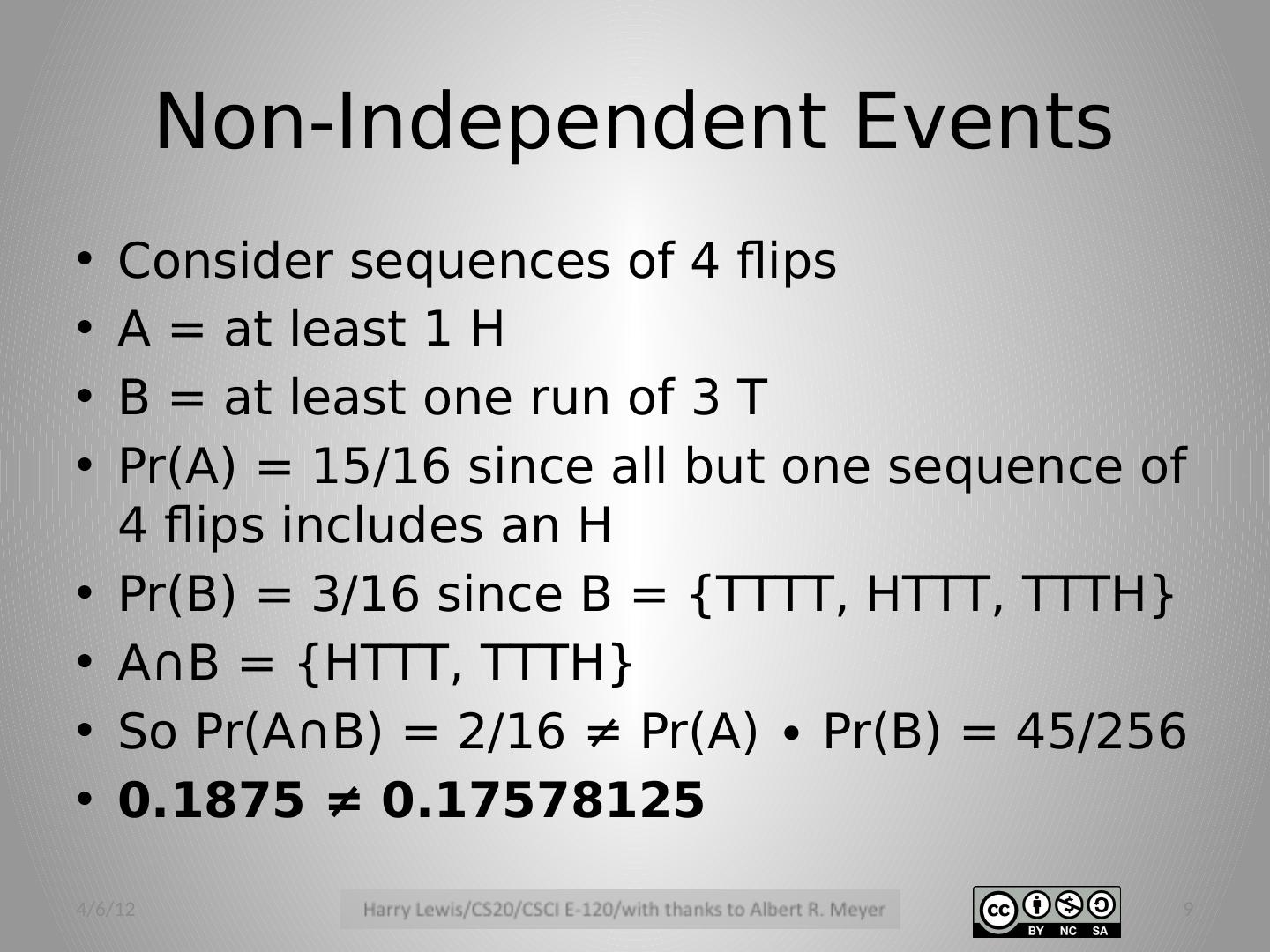 9 .Non-Independent Events Consider sequences of 4 flips A = at least 1 H B = at least one run of 3 T Pr(A ) = 15/16 since all but one sequence of 4 flips includes an H Pr(B ) = 3/16 since B = {TTTT, HTTT, TTTH} A∩B = {HTTT, TTTH} So Pr(A∩B ) = 2/16 ≠ Pr(A ) ∙ Pr(B ) = 45/256 0.1875 ≠ 0.17578125 4/6/12 9