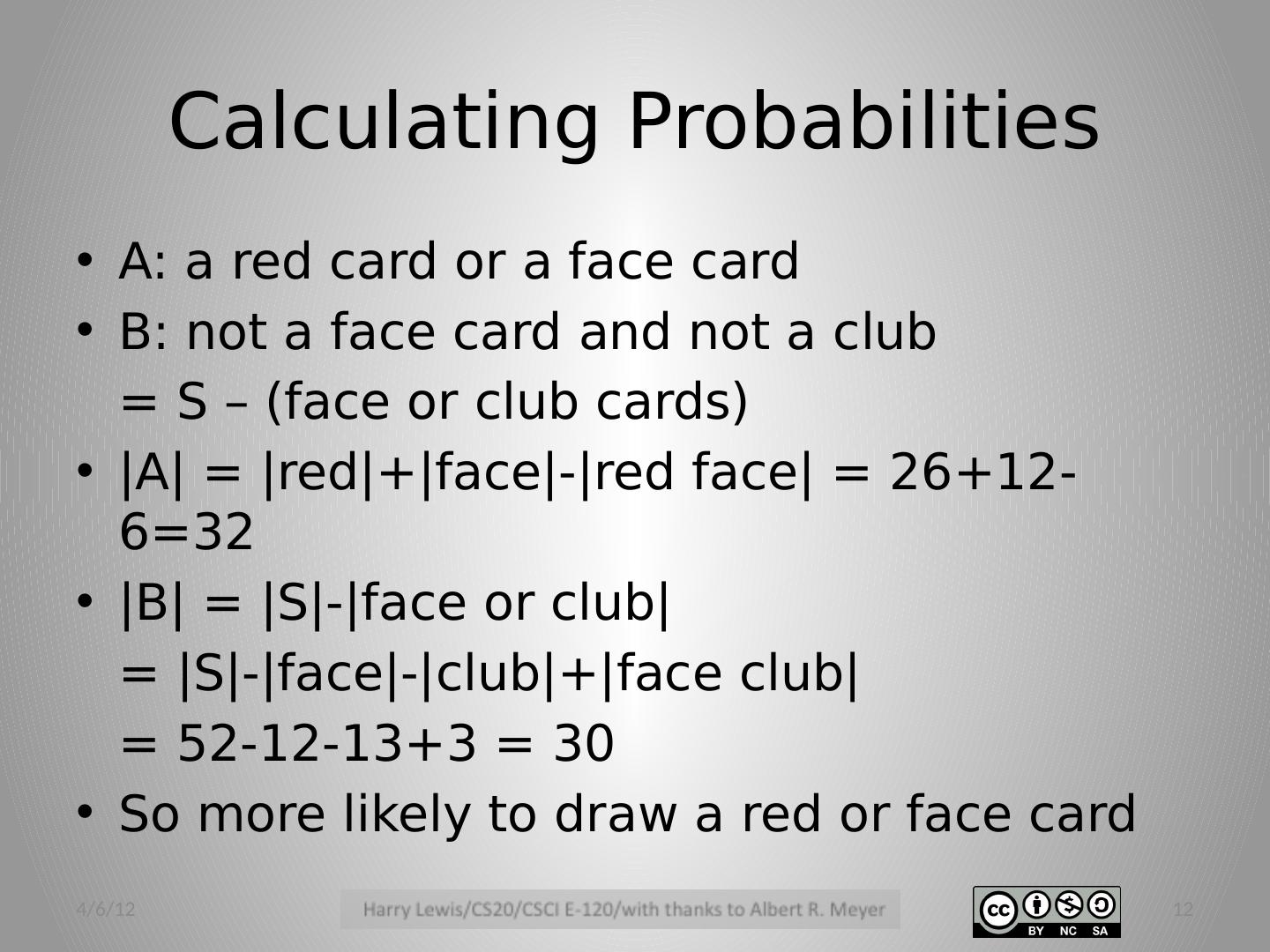 12 .Calculating Probabilities A: a red card or a face card B: not a face card and not a club = S – (face or club cards) |A| = | red|+|face |-|red face| = 26+12-6=32 |B| = |S|-|face or club| = |S|-|face|-| club|+|face club| = 52-12-13+3 = 30 So more likely to draw a red or face card 4/6/12 12