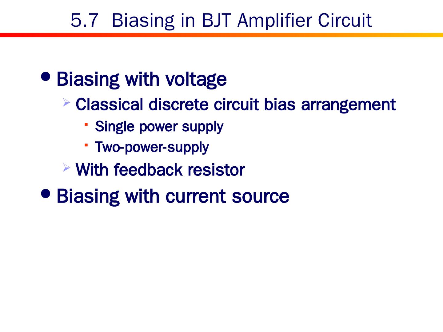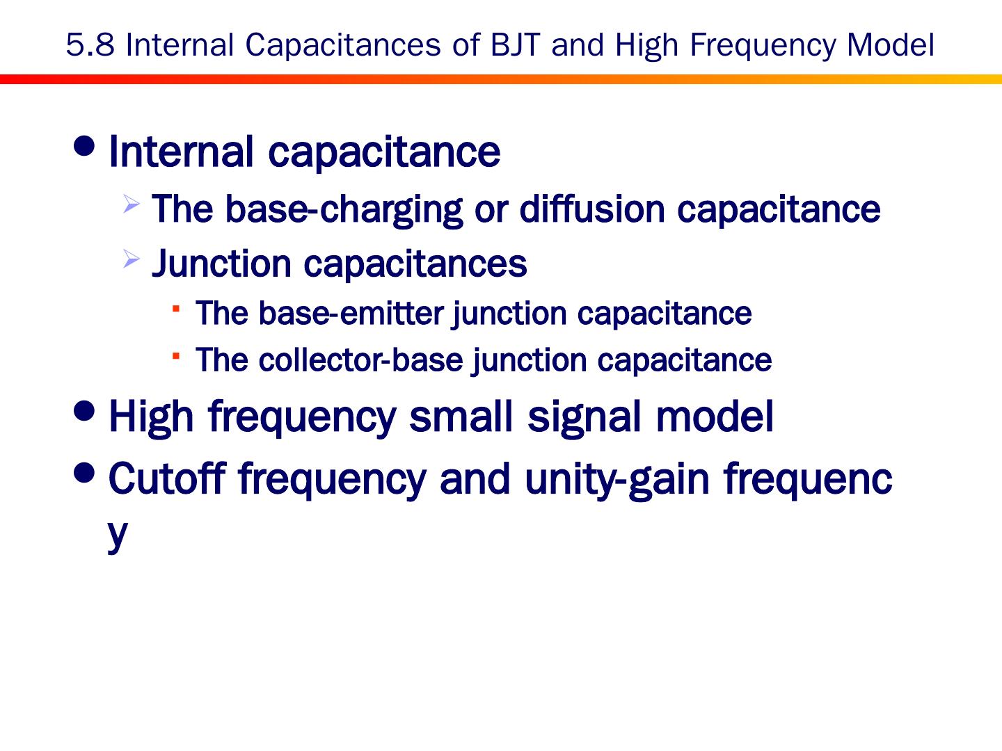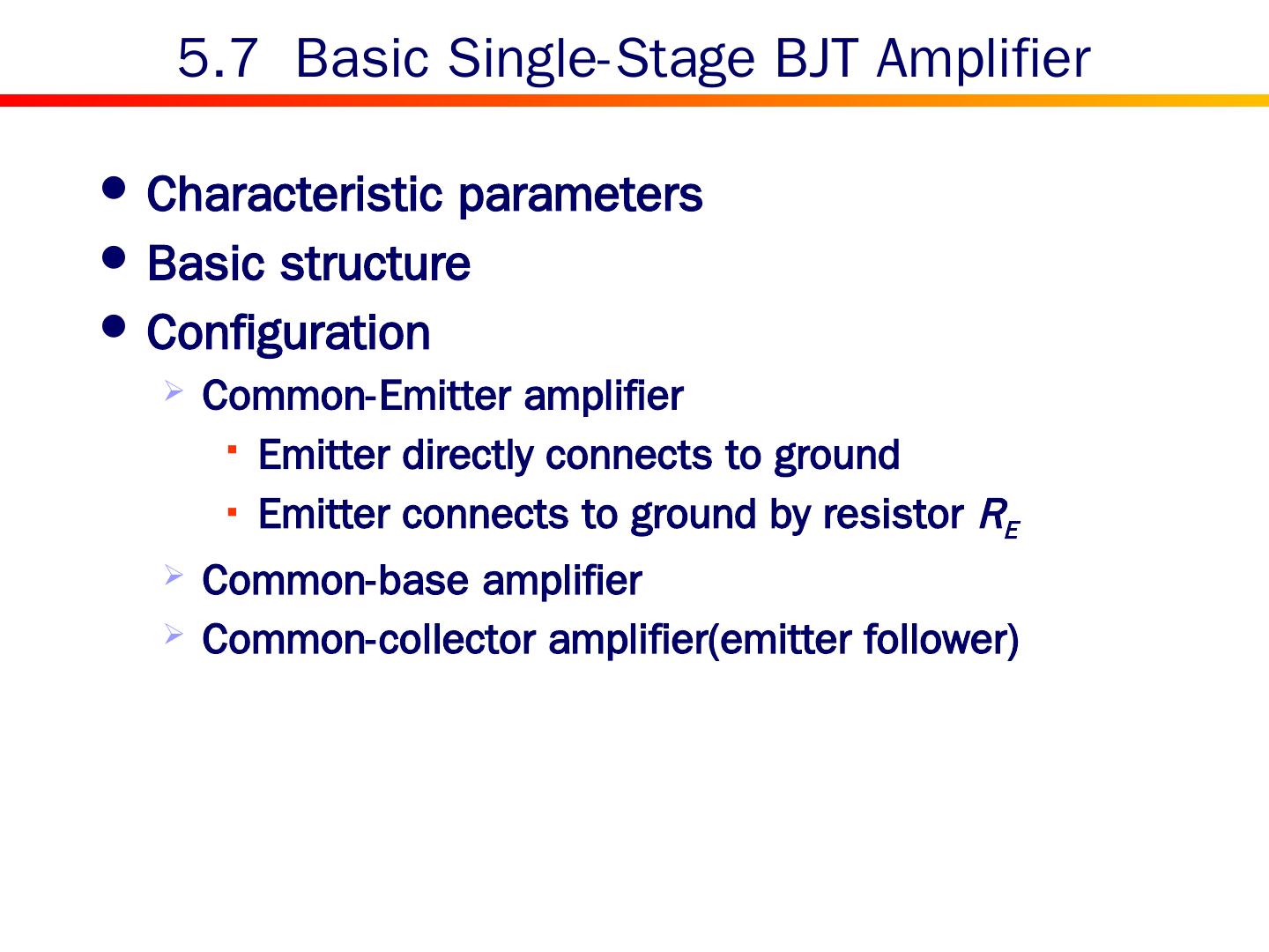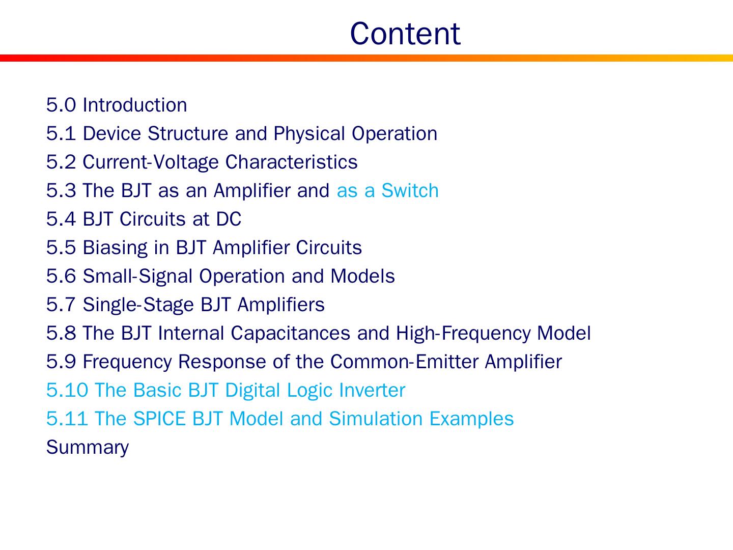 2 . Content 5.0 Introduction 5.1 Device Structure and Physical Operation 5.2 Current-Voltage Characteristics 5.3 The BJT as an Amplifier and as a Switch 5.4 BJT Circuits at DC 5.5 Biasing in BJT Amplifier Circuits 5.6 Small-Signal Operation and Models 5.7 Single-Stage BJT Amplifiers 5.8 The BJT Internal Capacitances and High-Frequency Model 5.9 Frequency Response of the Common-Emitter Amplifier 5.10 The Basic BJT Digital Logic Inverter 5.11 The SPICE BJT Model and Simulation Examples Summary