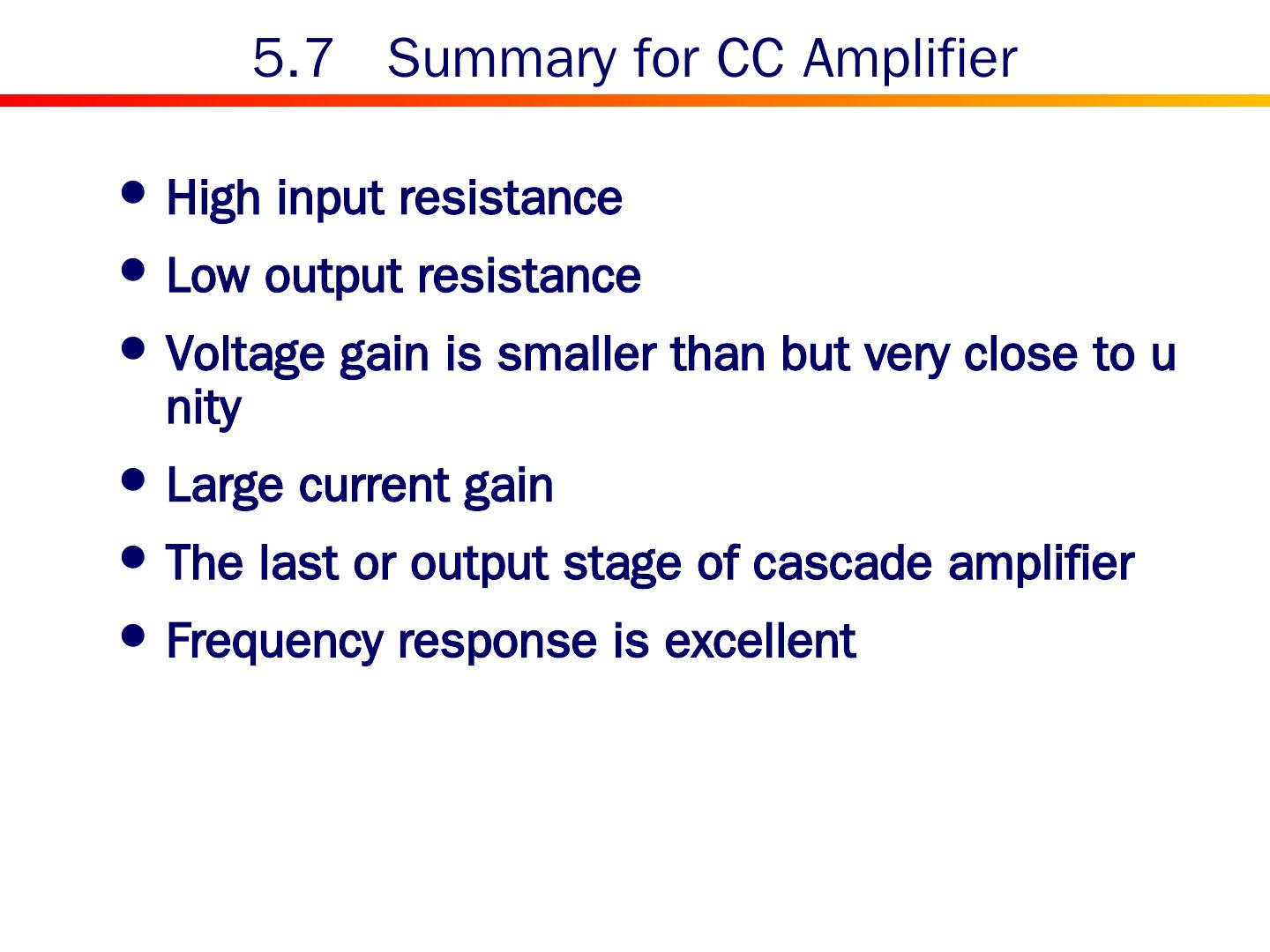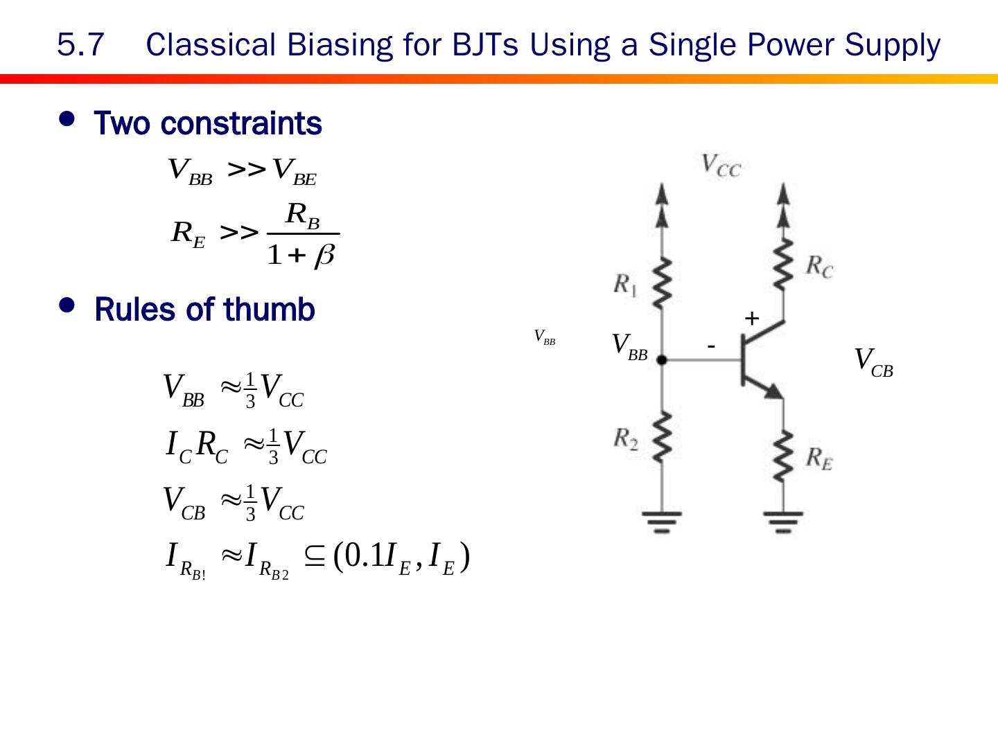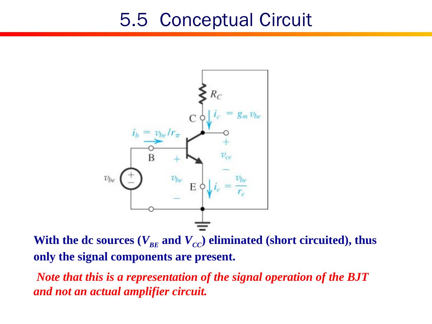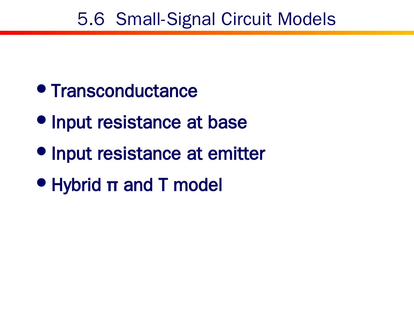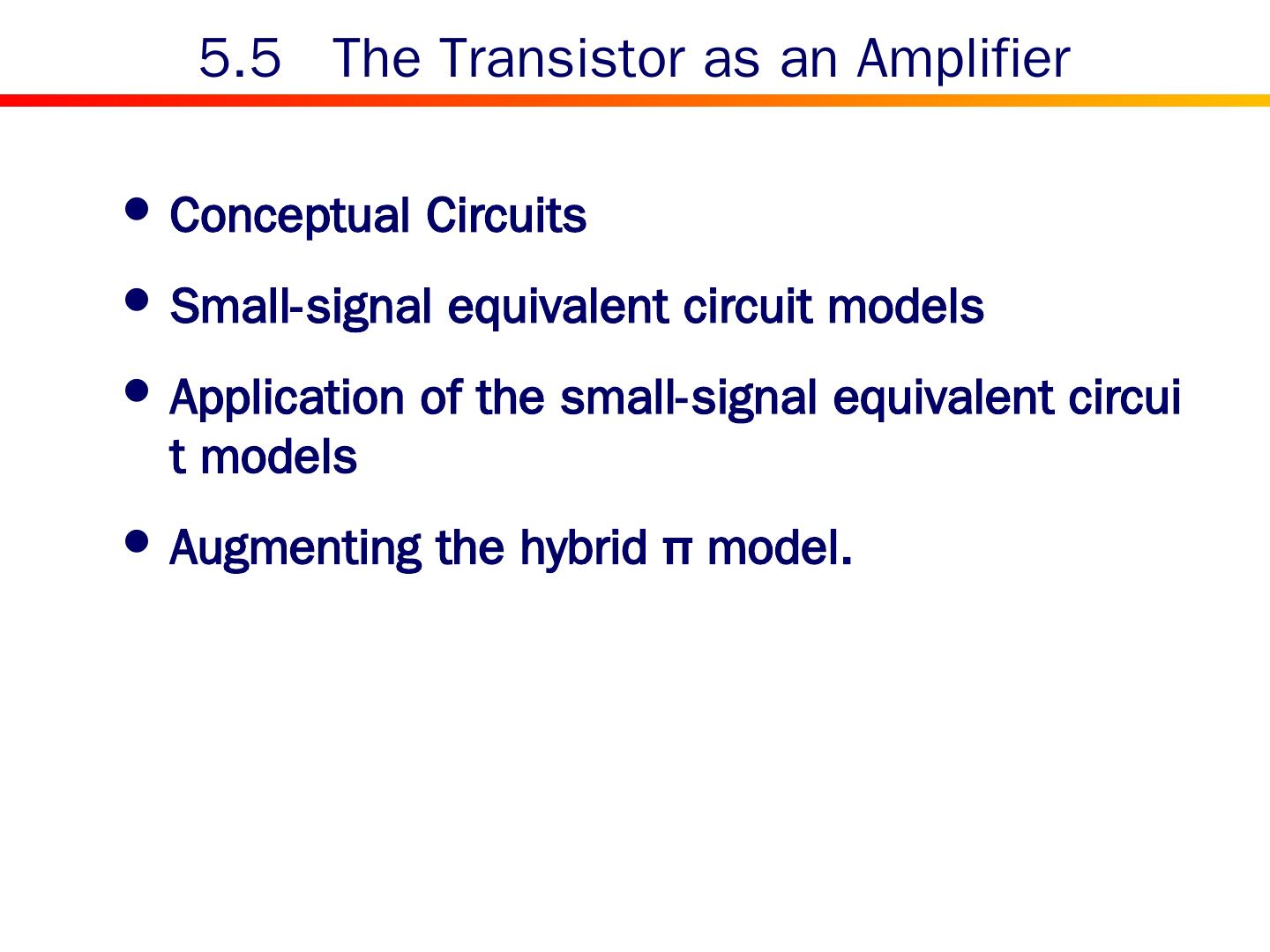 2 . Content 5.0 Introduction 5.1 Device Structure and Physical Operation 5.2 Current-Voltage Characteristics 5.3 The BJT as an Amplifier and as a Switch 5.4 BJT Circuits at DC 5.5 Biasing in BJT Amplifier Circuits 5.6 Small-Signal Operation and Models 5.7 Single-Stage BJT Amplifiers 5.8 The BJT Internal Capacitances and High-Frequency Model 5.9 Frequency Response of the Common-Emitter Amplifier 5.10 The Basic BJT Digital Logic Inverter 5.11 The SPICE BJT Model and Simulation Examples Summary
