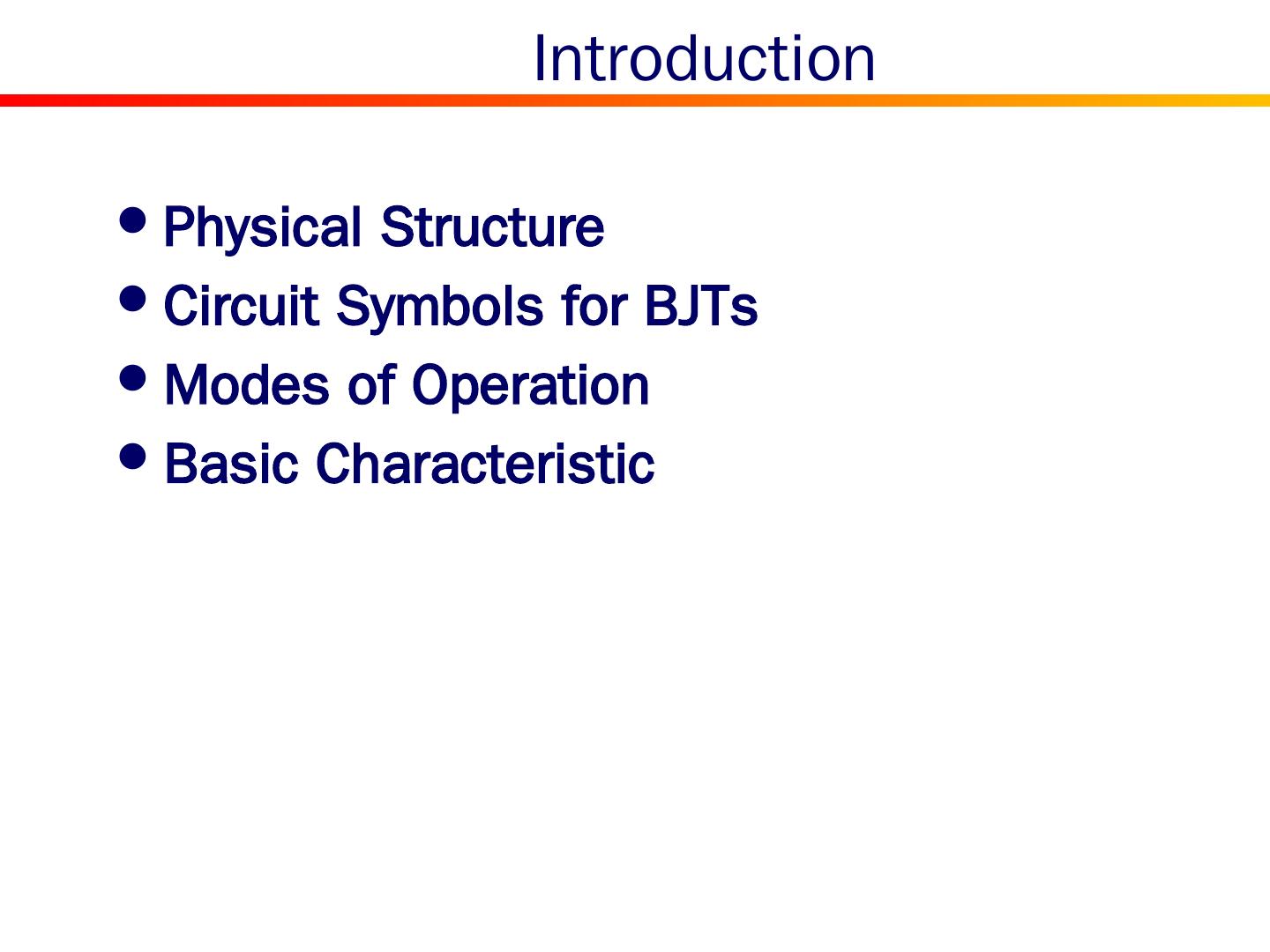 3 . Introduction Physical Structure Circuit Symbols for BJTs Modes of Operation Basic Characteristic