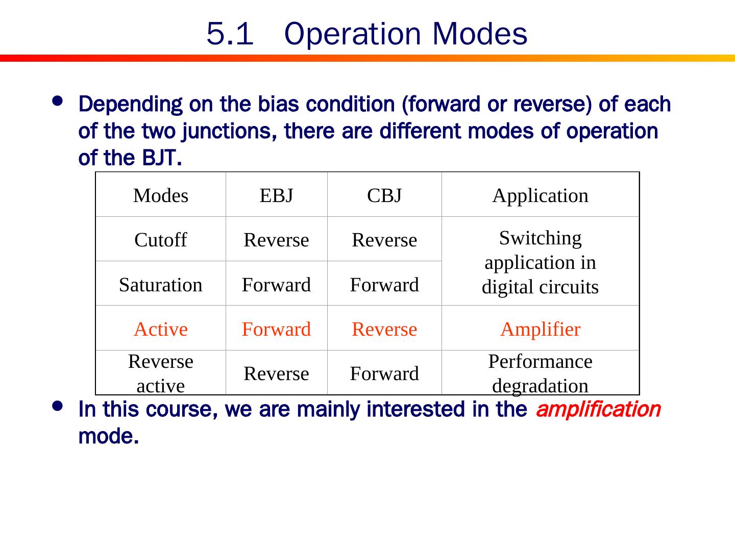 8 .5.1 Operation Modes Depending on the bias condition (forward or reverse) of each of the two junctions, there are different modes of operation of the BJT. In this course, we are mainly interested in the amplification mode. Modes EBJ CBJ Application Cutoff Reverse Reverse Switching application in digital circuits Saturation Forward Forward Active Forward Reverse Amplifier Reverse active Reverse Forward Performance degradation