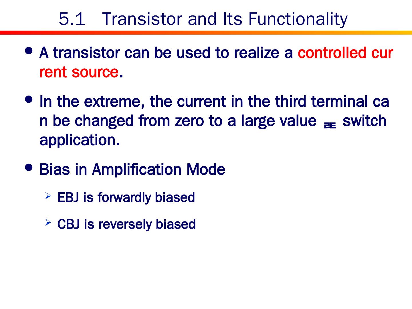 9 .5.1 Transistor and Its Functionality A transistor can be used to realize a controlled current source . In the extreme, the current in the third terminal can be changed from zero to a large value switch application. Bias in Amplification Mode EBJ is forwardly biased CBJ is reversely biased