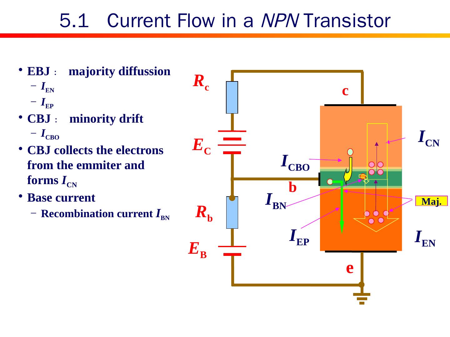 10 .R b R c E B E C e c b I EN I EP Maj. I CN I CBO I BN 5.1 Current Flow in a NPN Transistor EBJ : majority diffussion I EN I EP CBJ : minority drift I CBO CBJ collects the electrons from the emmiter and forms I CN Base current Recombination current I BN