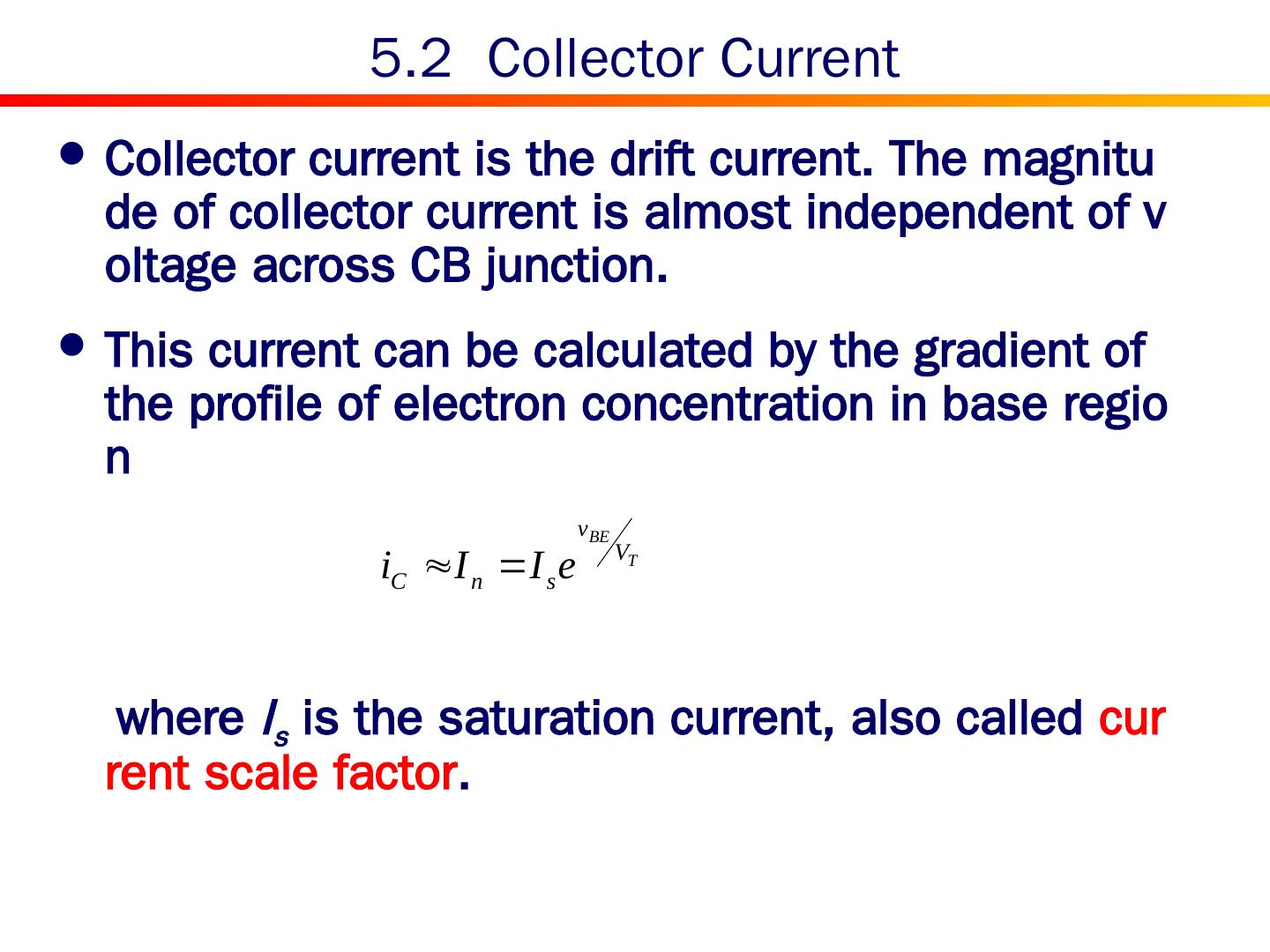 14 .5.2 Collector Current Collector current is the drift current. The magnitude of collector current is almost independent of voltage across CB junction. This current can be calculated by the gradient of the profile of electron concentration in base region where I s is the saturation current, also called current scale factor .