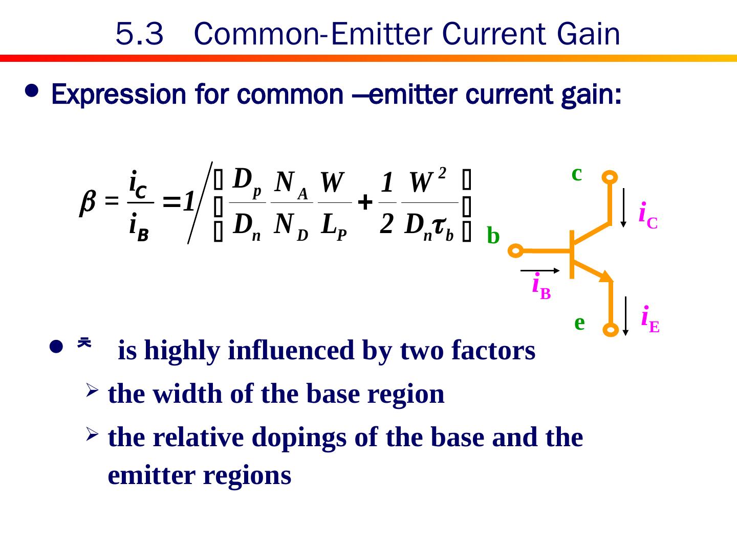 17 .5.3 Common-Emitter Current Gain Expression for common –emitter current gain: c b e i E i C i B is highly influenced by two factors the width of the base region the relative dopings of the base and the emitter regions