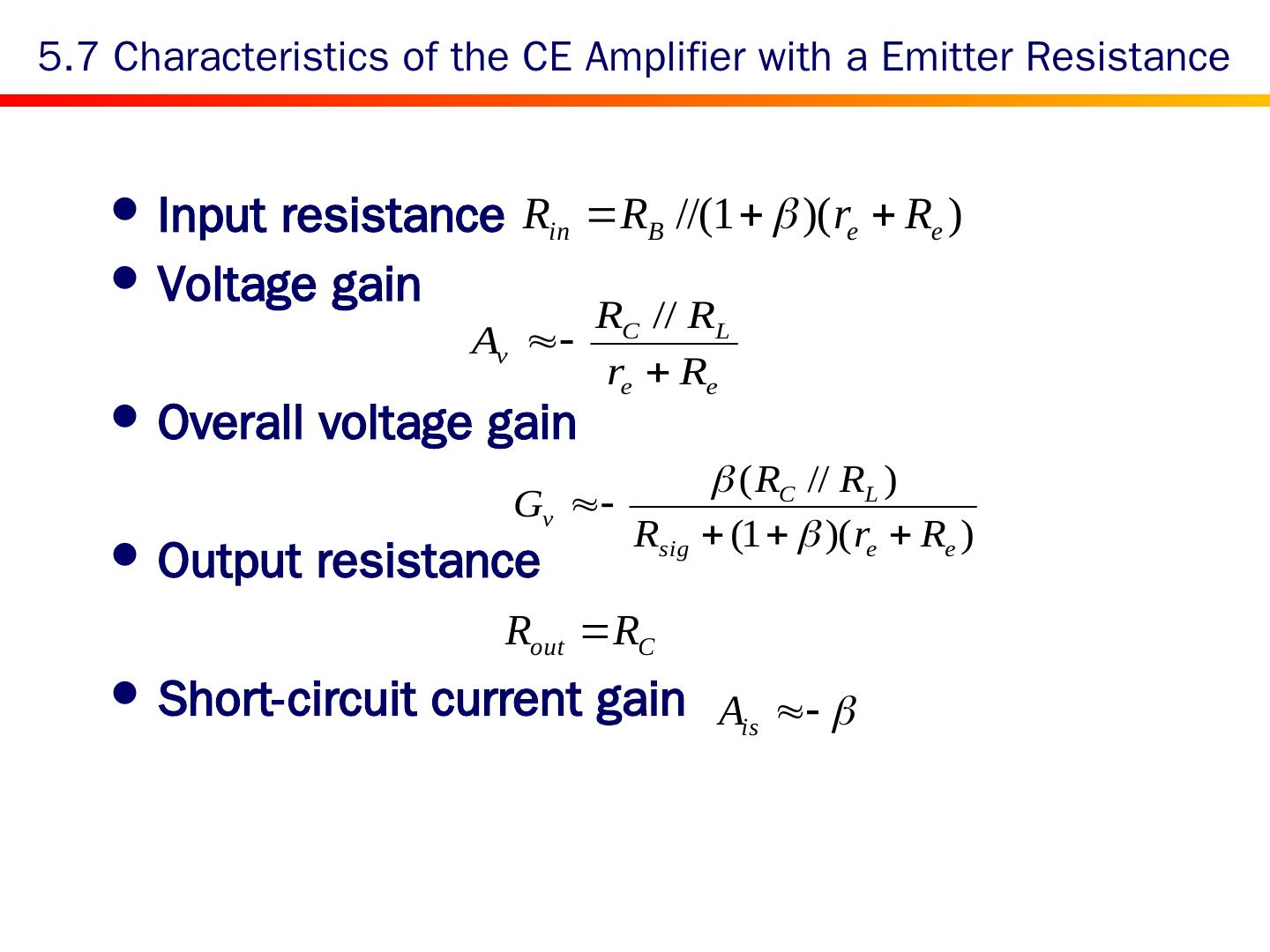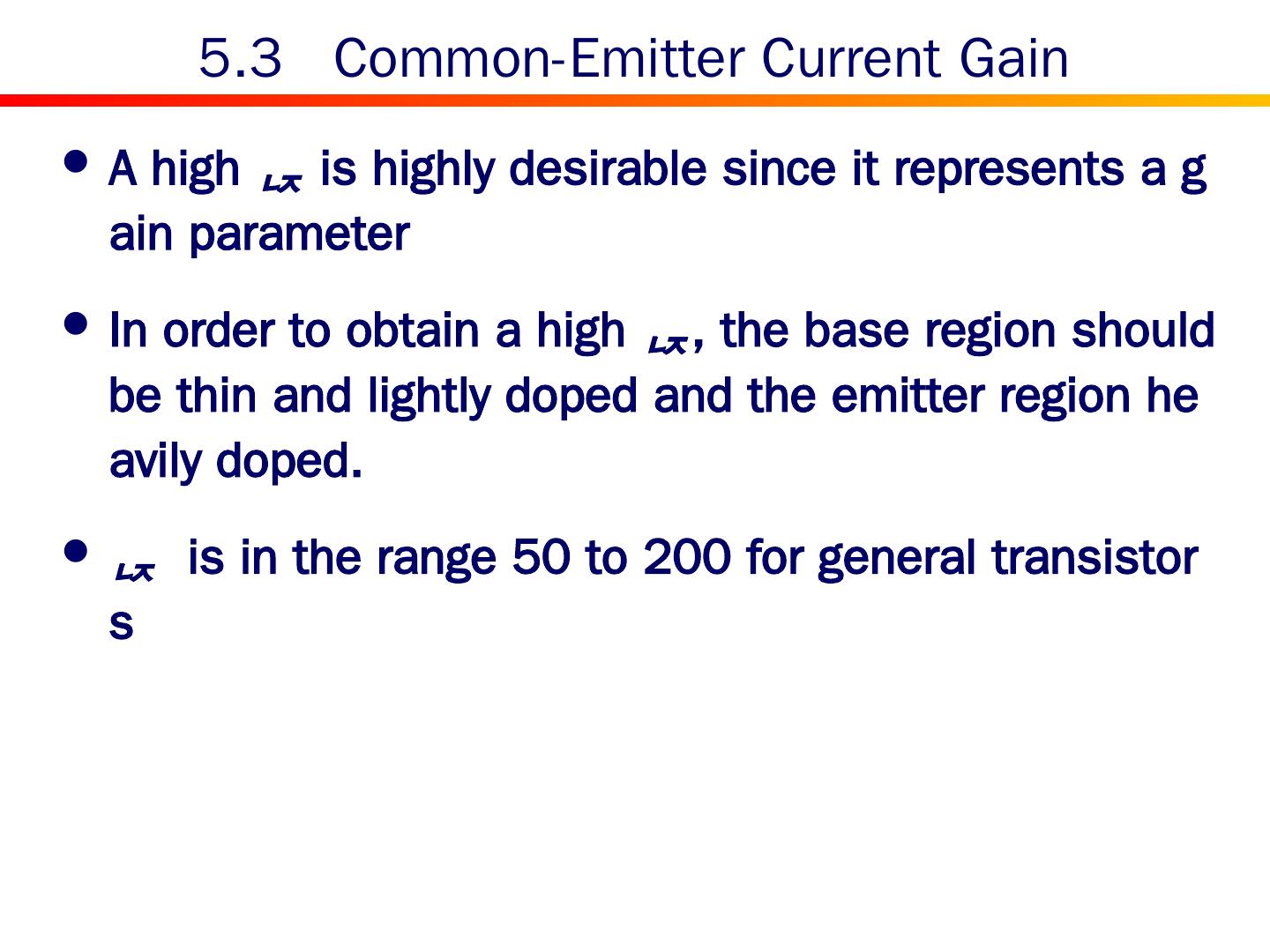 18 .5.3 Common-Emitter Current Gain A high is highly desirable since it represents a gain parameter In order to obtain a high , the base region should be thin and lightly doped and the emitter region heavily doped. is in the range 50 to 200 for general transistors