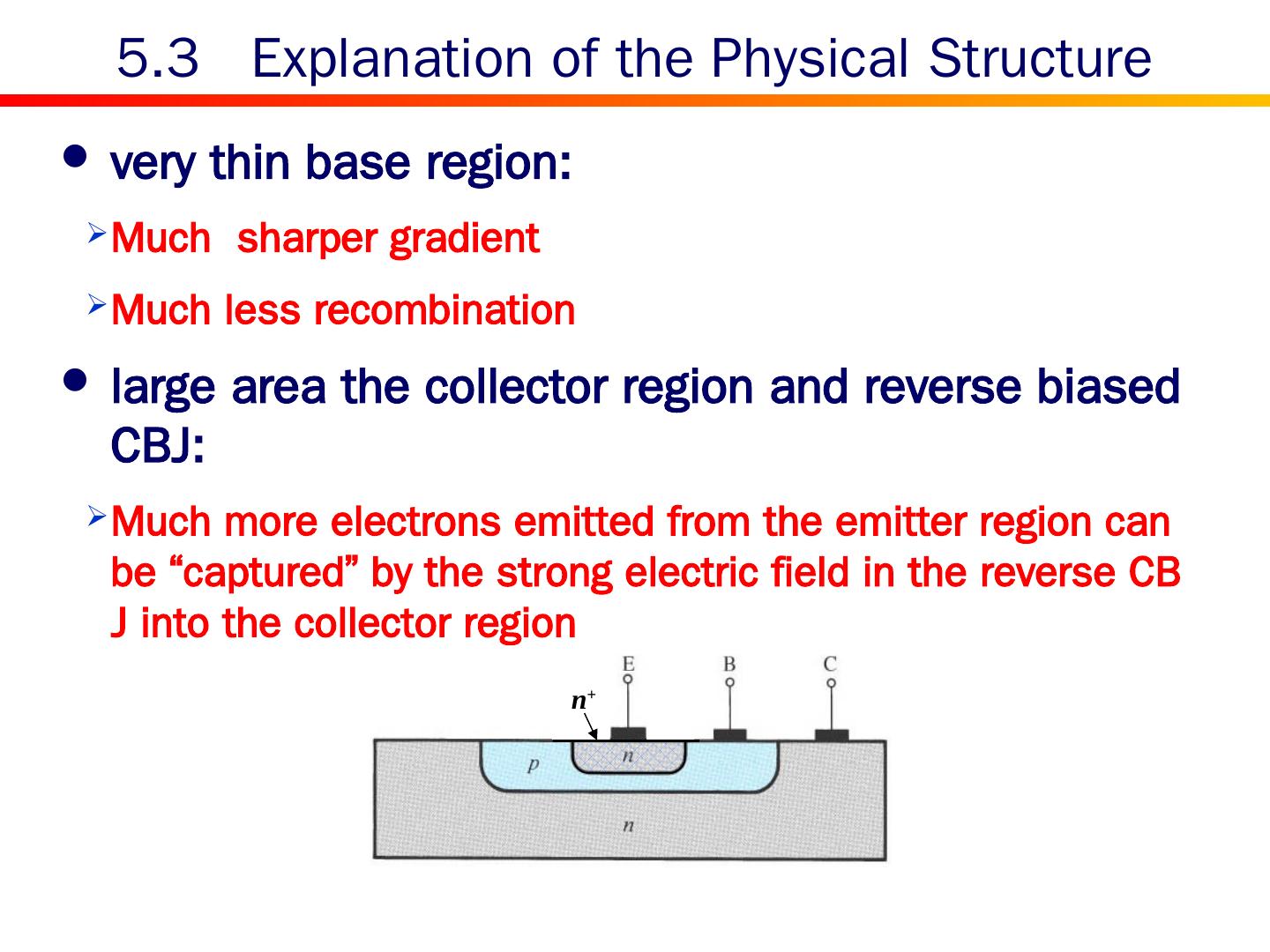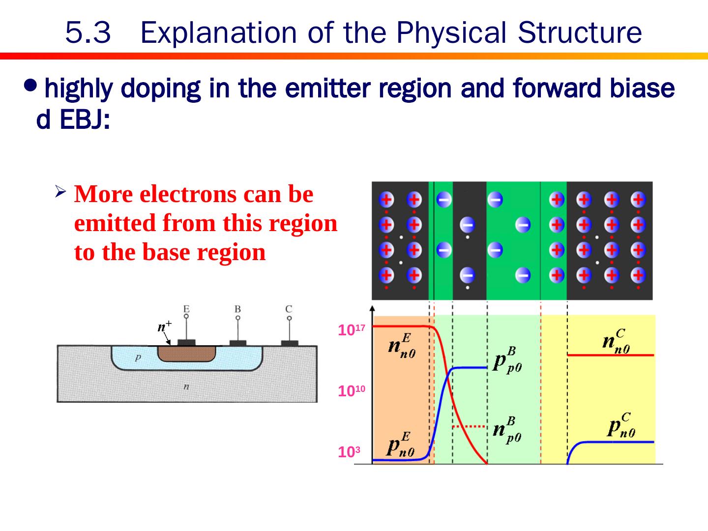 19 .highly doping in the emitter region and forward biased EBJ: 5.3 Explanation of the Physical Structure 10 17 10 10 10 3 More electrons can be emitted from this region to the base region
