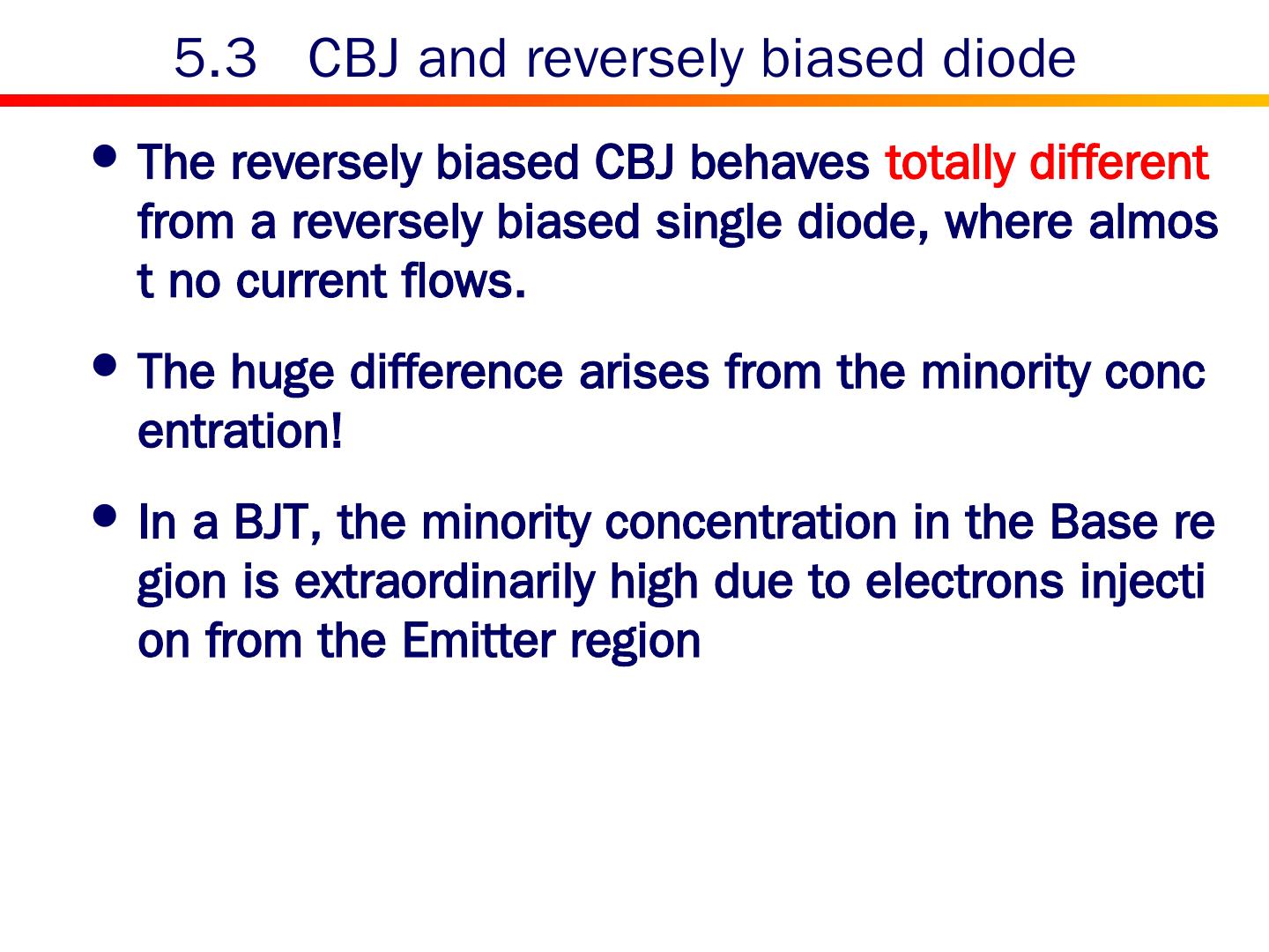 21 .5.3 CBJ and reversely biased diode The reversely biased CBJ behaves totally different from a reversely biased single diode, where almost no current flows. The huge difference arises from the minority concentration! In a BJT, the minority concentration in the Base region is extraordinarily high due to electrons injection from the Emitter region