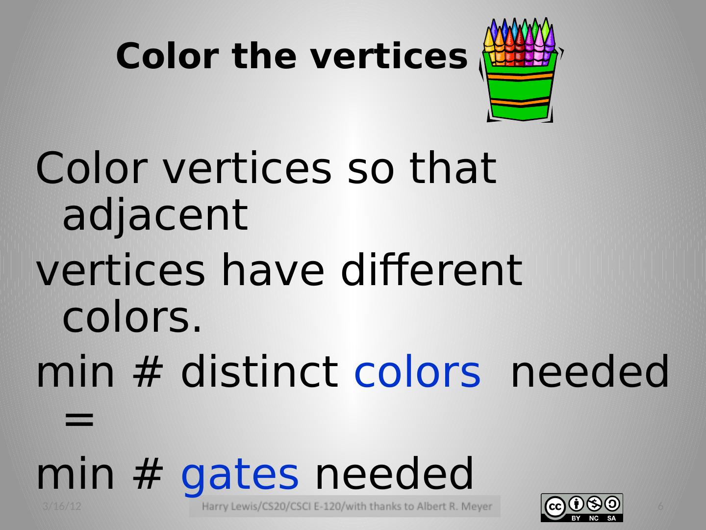 6 .Color vertices so that adjacent vertices have different colors. min # distinct colors needed = min # gates needed Color the vertices 3/16/12 6