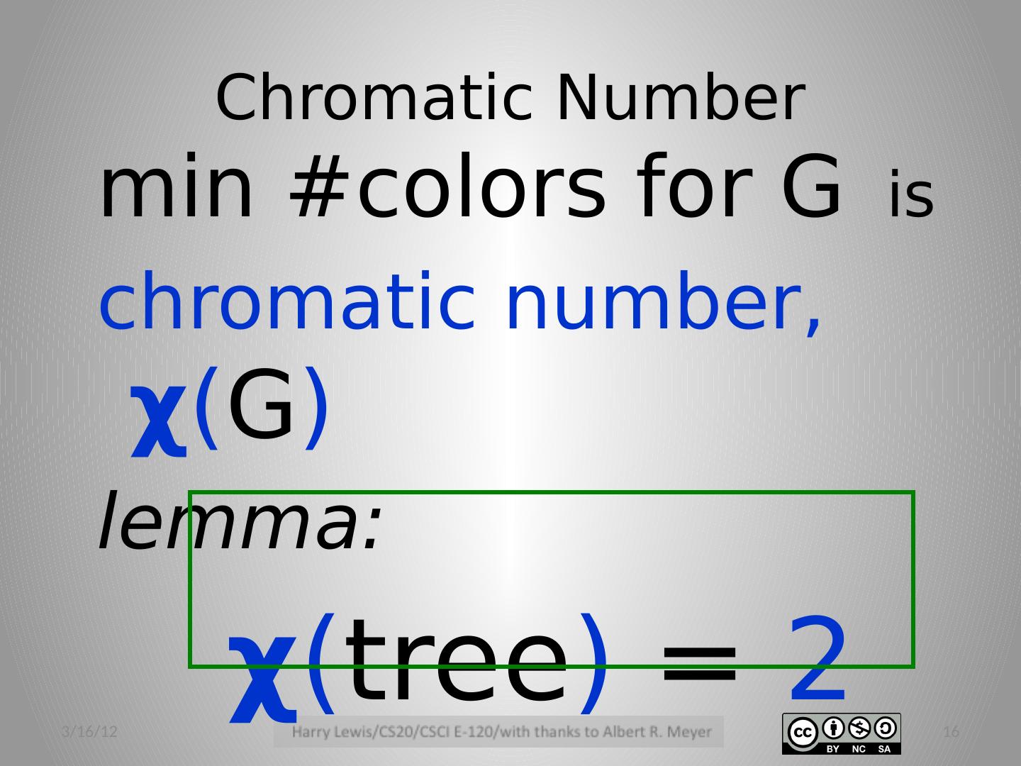 16 .Chromatic Number min #colors for G is chromatic number, χ ( G ) lemma: χ ( tree ) = 2 3/16/12 16