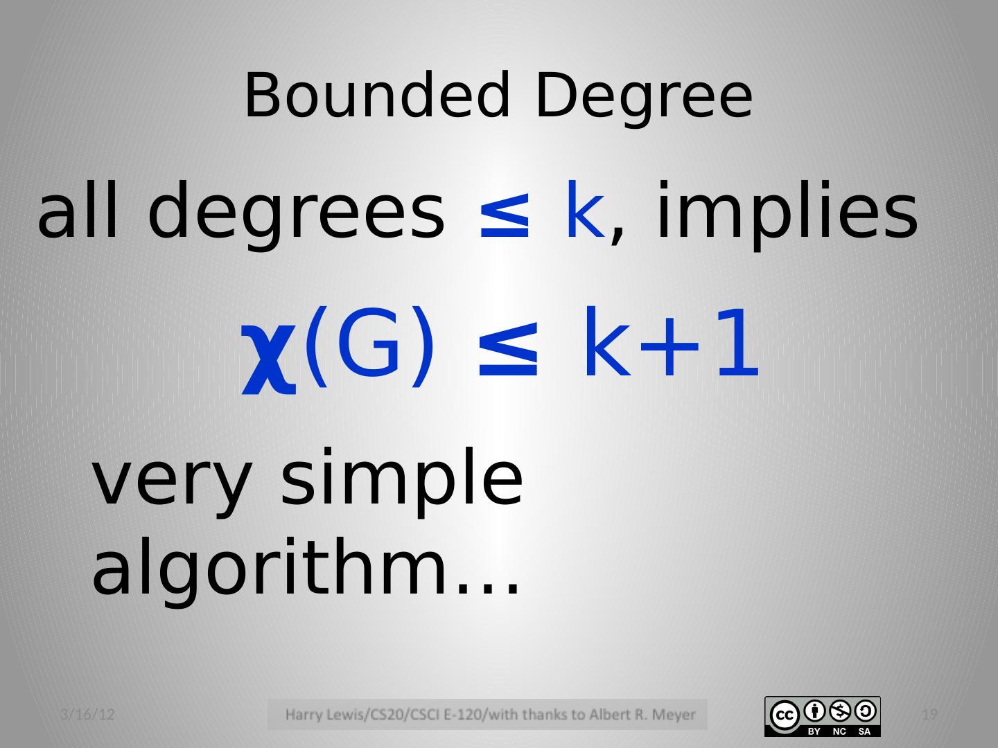 19 .Bounded Degree all degrees ≤ k , implies very simple algorithm… χ ( G ) ≤ k+1 3/16/12 19