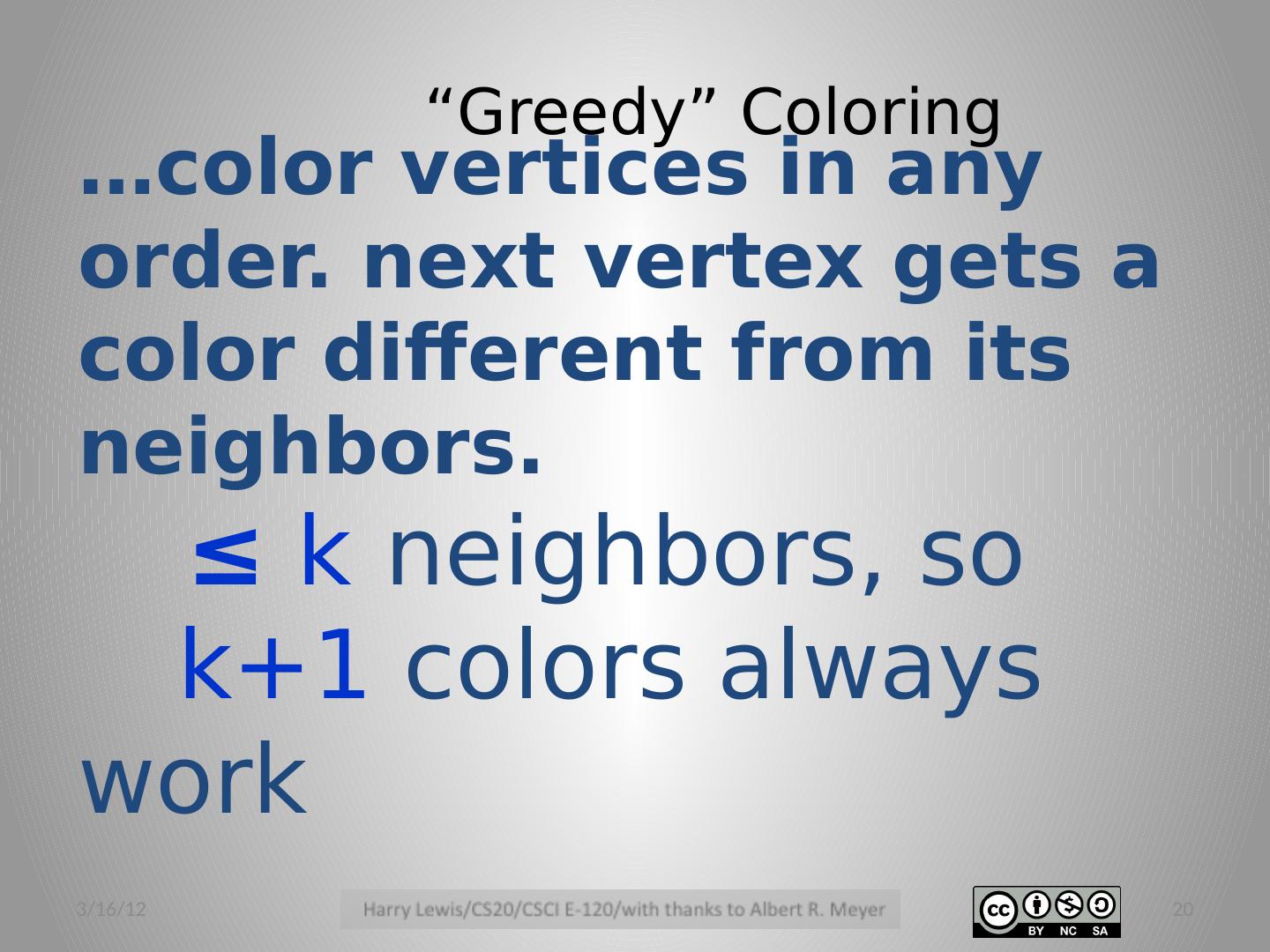 20 .“Greedy” Coloring …color vertices in any order. next vertex gets a color different from its neighbors. ≤ k neighbors, so k +1 colors always work 3/16/12 20