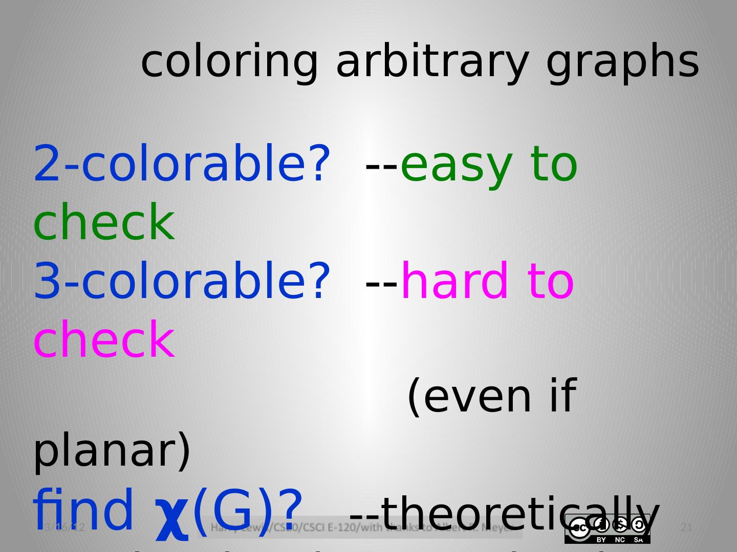 21 .coloring arbitrary graphs 2-colorable? -- easy to check 3-colorable? -- hard to check (even if planar) find χ ( G )? --theoretically no harder than 3-color, but harder in practice 3/16/12 21
