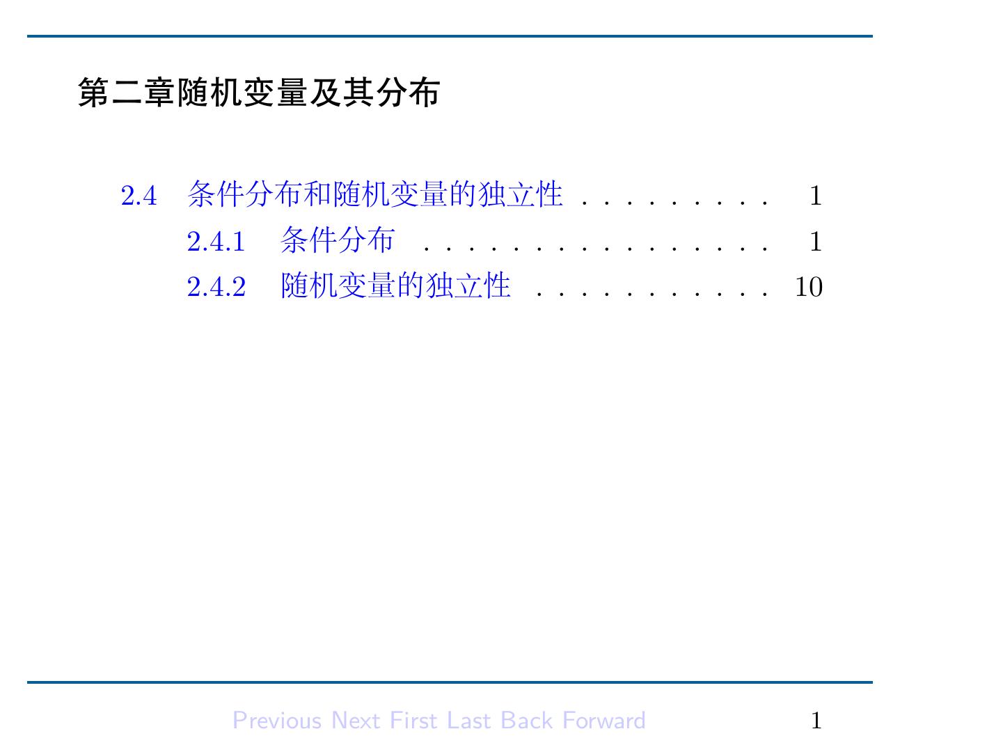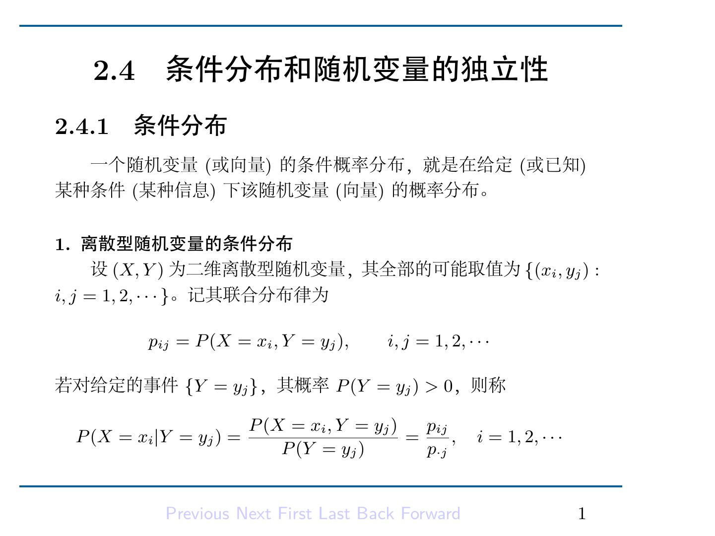 2 .第二章随机变量及其分布 2.4 条件分布和随机变量的独立性 . . . . . . . . . 1 2.4.1 条件分布 . . . . . . . . . . . . . . . . 1 2.4.2 随机变量的独立性 . . . . . . . . . . . 10 Previous Next First Last Back Forward 1