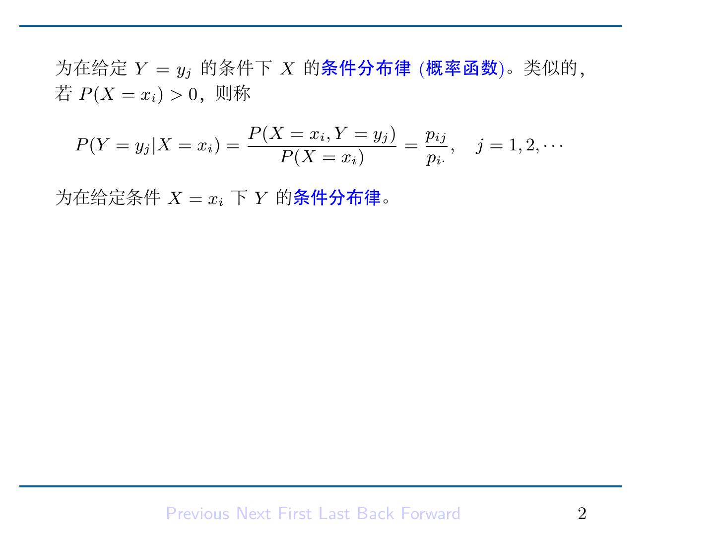 4 .为在给定 Y = yj 的条件下 X 的条件分布律 (概率函数)。类似的, 若 P (X = xi ) > 0,则称 P (X = xi , Y = yj ) pij P (Y = yj |X = xi ) = = , j = 1, 2, · · · P (X = xi ) pi· 为在给定条件 X = xi 下 Y 的条件分布律。 Previous Next First Last Back Forward 2