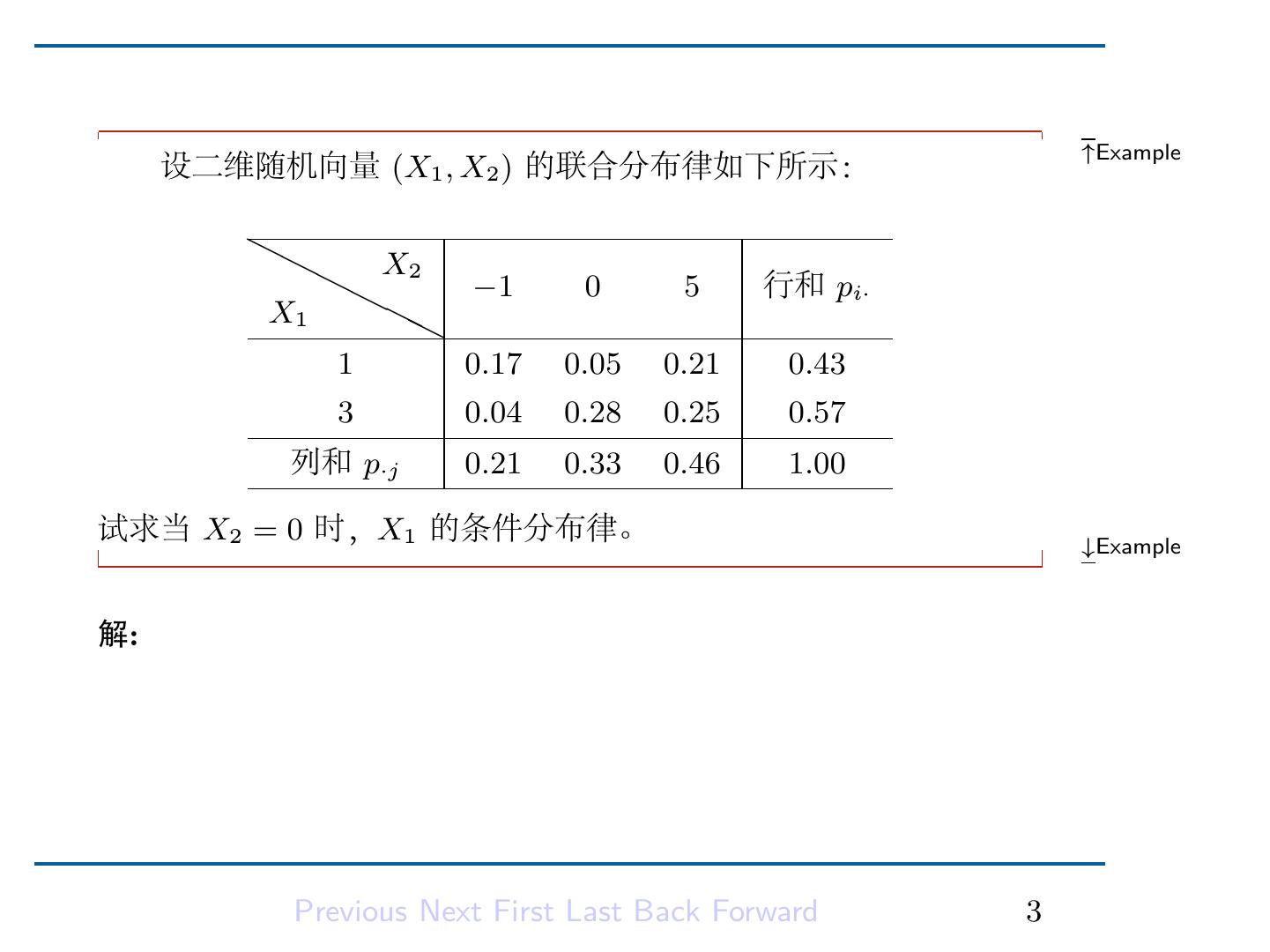 5 . ↑Example 设二维随机向量 (X1 , X2 ) 的联合分布律如下所示: ❍❍ X ❍❍ 2 −1 0 5 行和 pi· X1 ❍❍ 1 0.17 0.05 0.21 0.43 3 0.04 0.28 0.25 0.57 列和 p·j 0.21 0.33 0.46 1.00 试求当 X2 = 0 时,X1 的条件分布律。 ↓Example 解: 由联合分布律先算出两个边缘分布律 pi· 与 p·j 并填入表中,由 此进一步算出条件分布律为: 0.05 5 P {X1 = 1|X2 = 0} = = 0.33 33 0.28 28 而 P {X1 = 3|X2 = 0} = = . 0.33 33 Previous Next First Last Back Forward 3